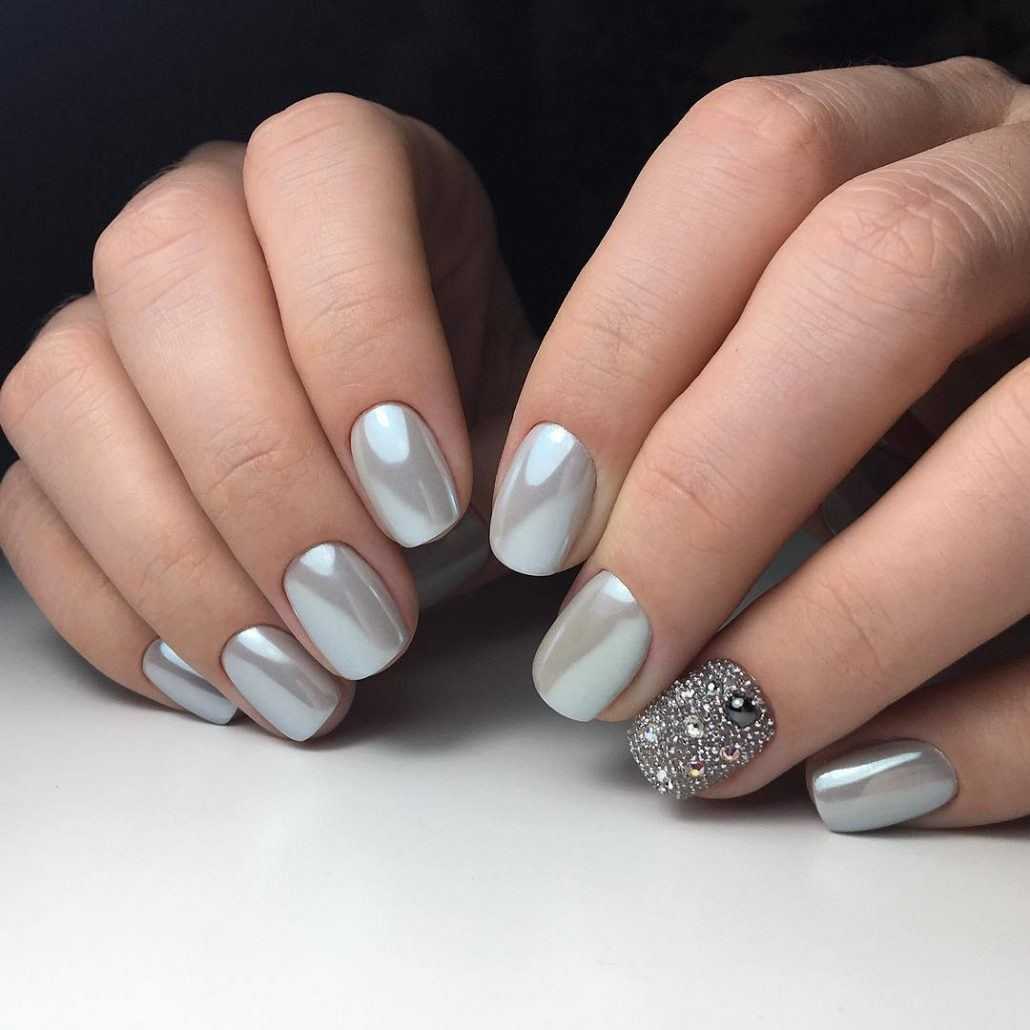 В продаже можно найти радужную, голографическую, серебряную и другие разновидности втирки. Каждая втирка проявляет себя по-разному в зависимости от основного фона. Например, серебряная втирка придает зеркальный блеск черному цвету, радужная втирка освежает розовый и белый маникюр. Чтобы создать нежный маникюр на коротких ногтях лучше всего использовать жемчужную втирку. Она шикарно смотрится на белом фоне. Нежная жемчужная втирка на белых ноготках делает маникюр невероятно нежным и женственным. На фото ниже вы можете увидеть несколько примеров этого шикарного дизайна ногтей.
