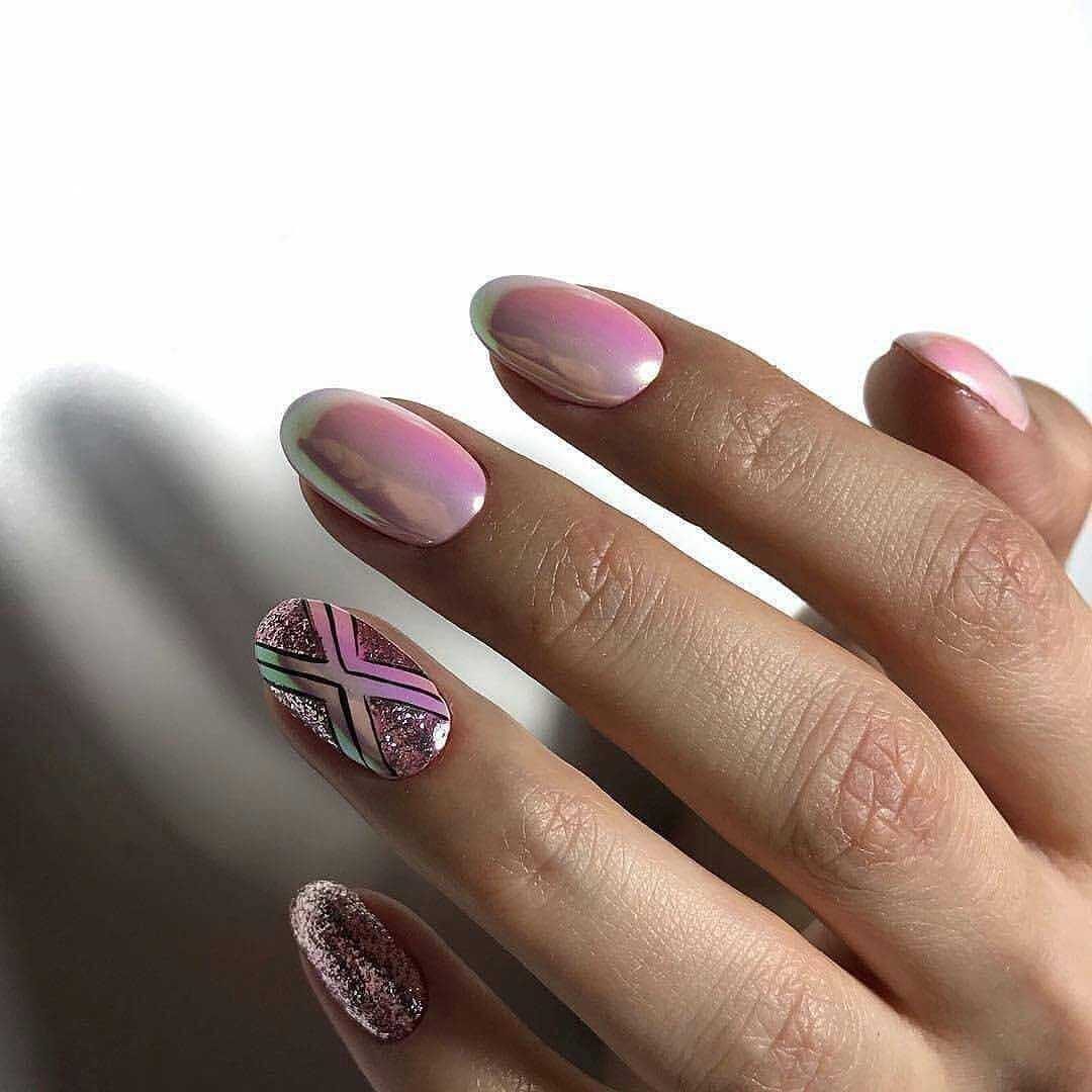 - Дополненный различными украшениями вариант – интересная новинка следующего сезона. Чаще всего в качестве декора мастера используют зеркальную пудру, разноцветную втирку, матовое покрытие, песок, бусины, стразы.