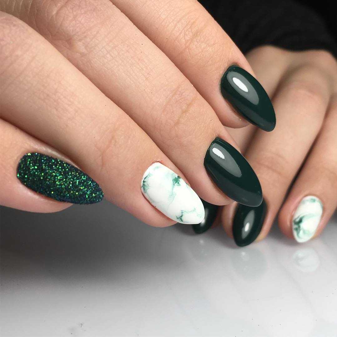 Это классика жанра. Отметим, что у самого хаки есть множество нюансов и оттенков. И очень красиво сочетать их в контрасте с белым – от почти фисташкового до темного хаки ноготки будут перемежаться с белым, бело-мраморным, белым и золотистой отделкой, белым и графическими вкраплениями, рисунками. Хорош контраст с жемчужным, молочным белым. Можно добавить эффектные кусочки фольги – золотистые, серебристые.