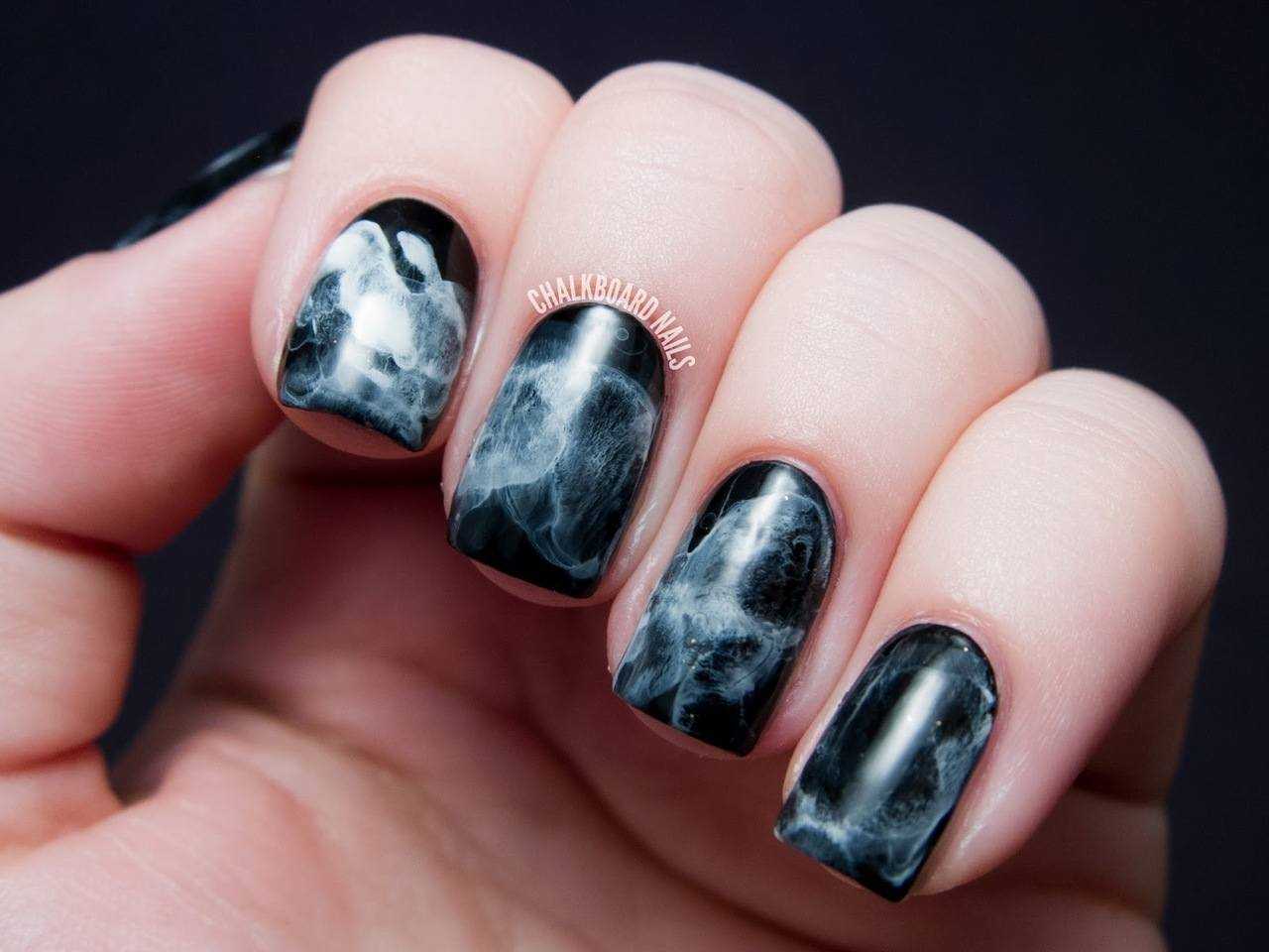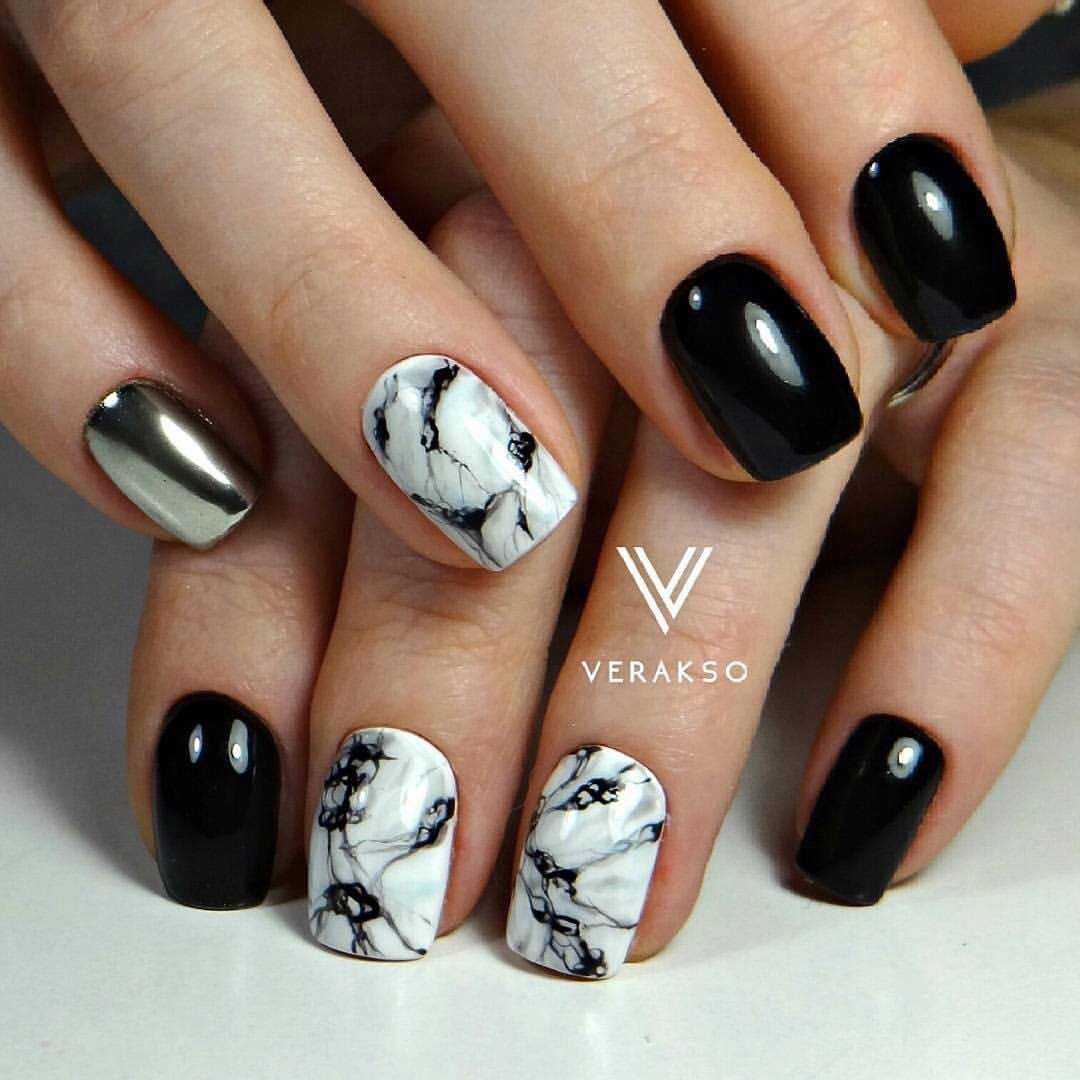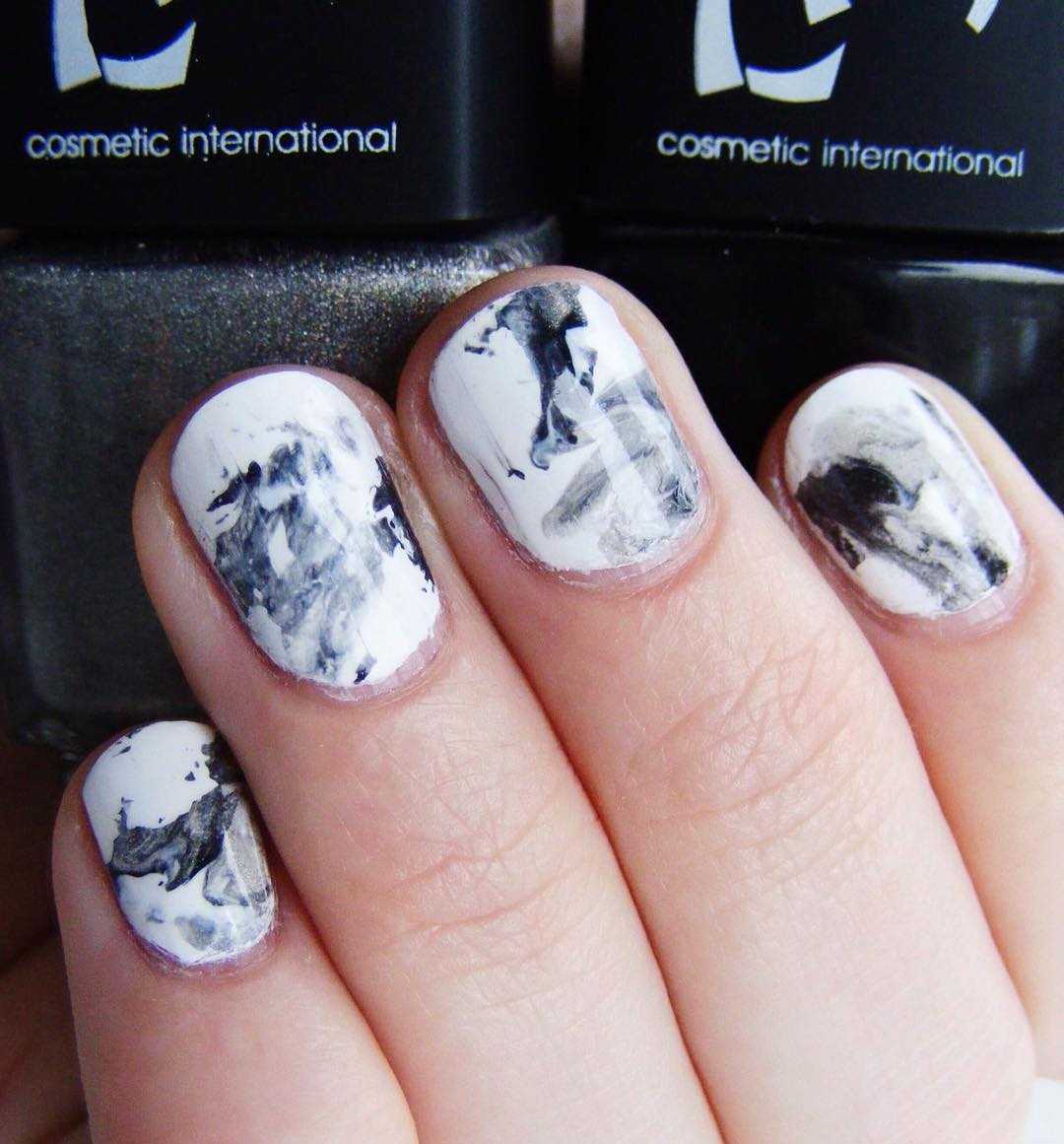Мраморный маникюр – новая и очень популярная техника, которая в черно-белом варианте выглядит лаконично и эстетично. Создать такой рисунок легко в домашних условиях. Для этого на ногти наносится белый лак, а на кусочке фольги отдельно смешиваются белый, черный и базовый слой. С помощью тонкой кисти или палочки нанесите готовую смесь на ногти, создавая неровные линии.
