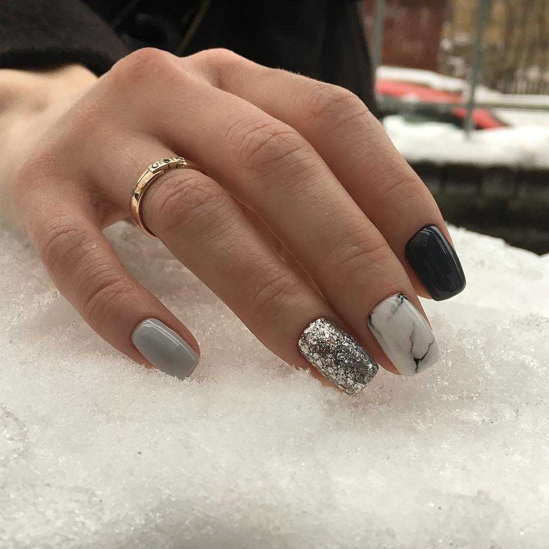 - Черный маникюр квадратной формы украсит дизайн с полосками, белыми кружочками, с черными точками, блёстками и стразами. Роскошно комбинирование с другими цветами и фактурами лаков. Особый шик черно красный маникюр, или черно белый маникюр на короткие ногти квадратной формы.