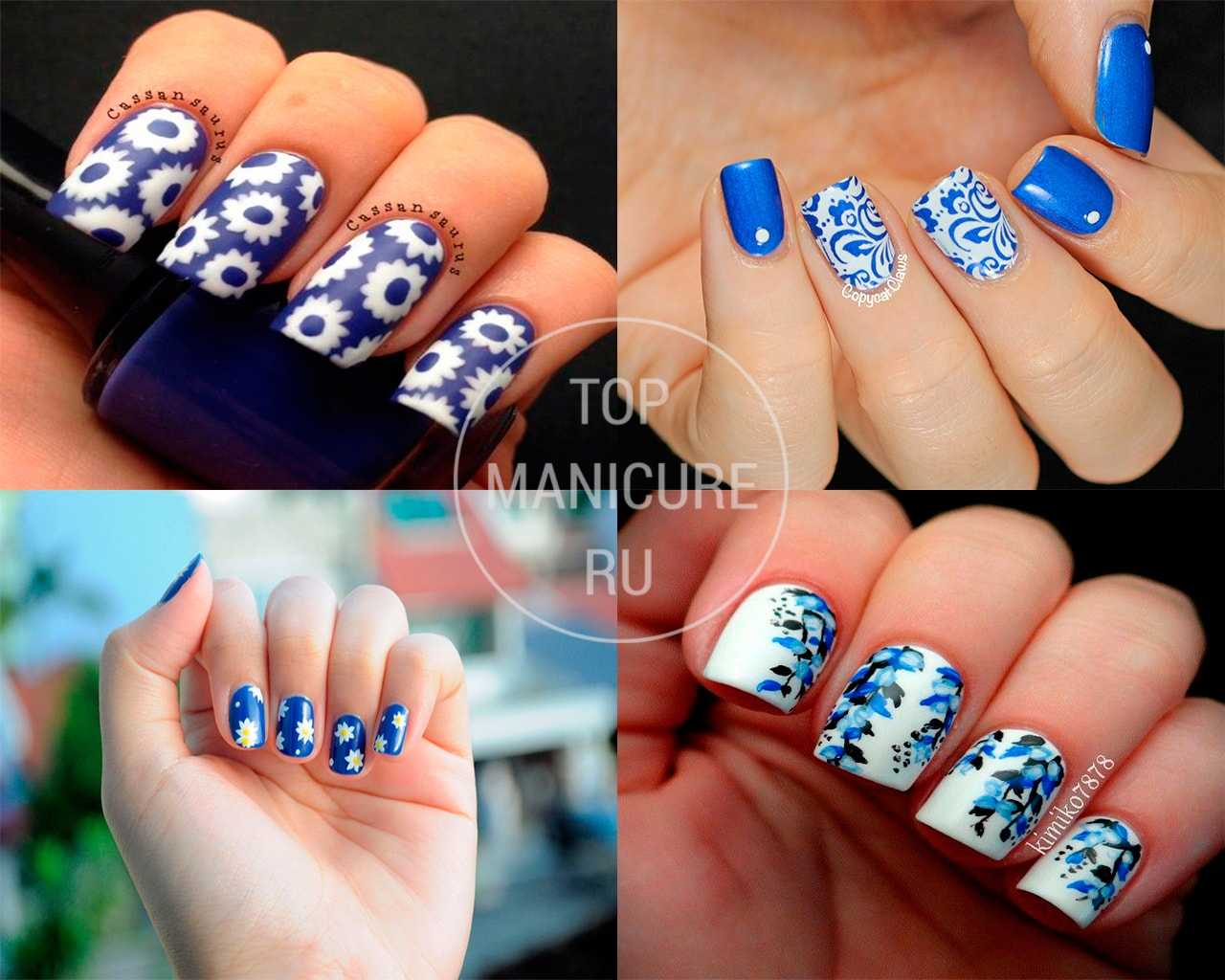 Оттенок синего признан самой подходящей основой для маникюра, на которую можно нанести цветы. Здесь можно использовать любую технику. Если вы выбрали синий цветок, лучшие оттенки для основы — белый, бежевый и золотой.