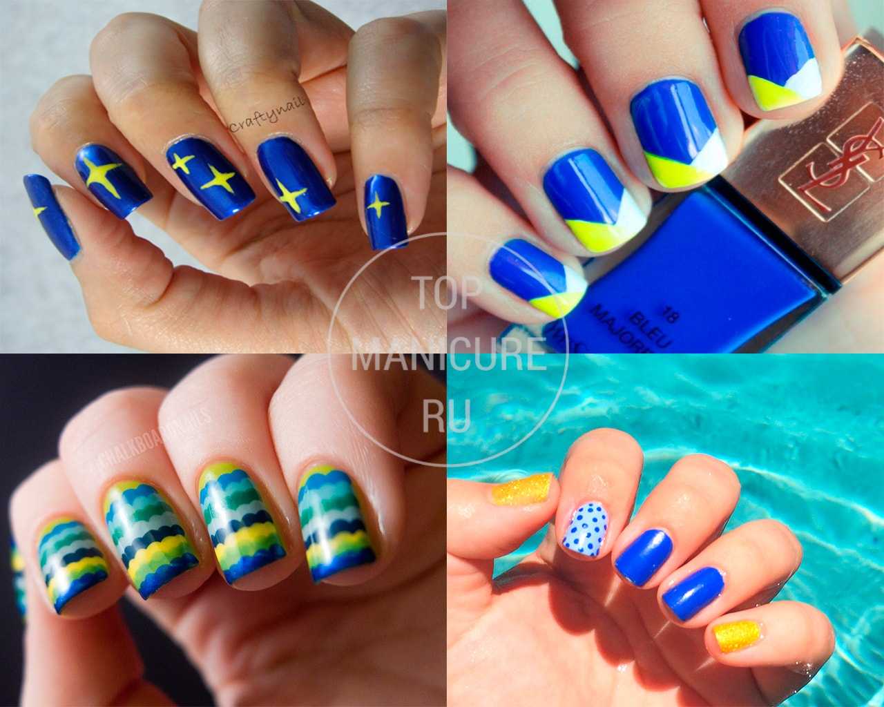 Сине-желтый маникюр может быть очень разным. Это и желтые ногти с синими лунками (фото 1), и яркий акцент на ногтях (фото 2), рисунки в виде звездочек (фото 3), треугольный френч (фото 4), желто-синие волны на ногтях (фото 5), желтые блестки (фото 6).