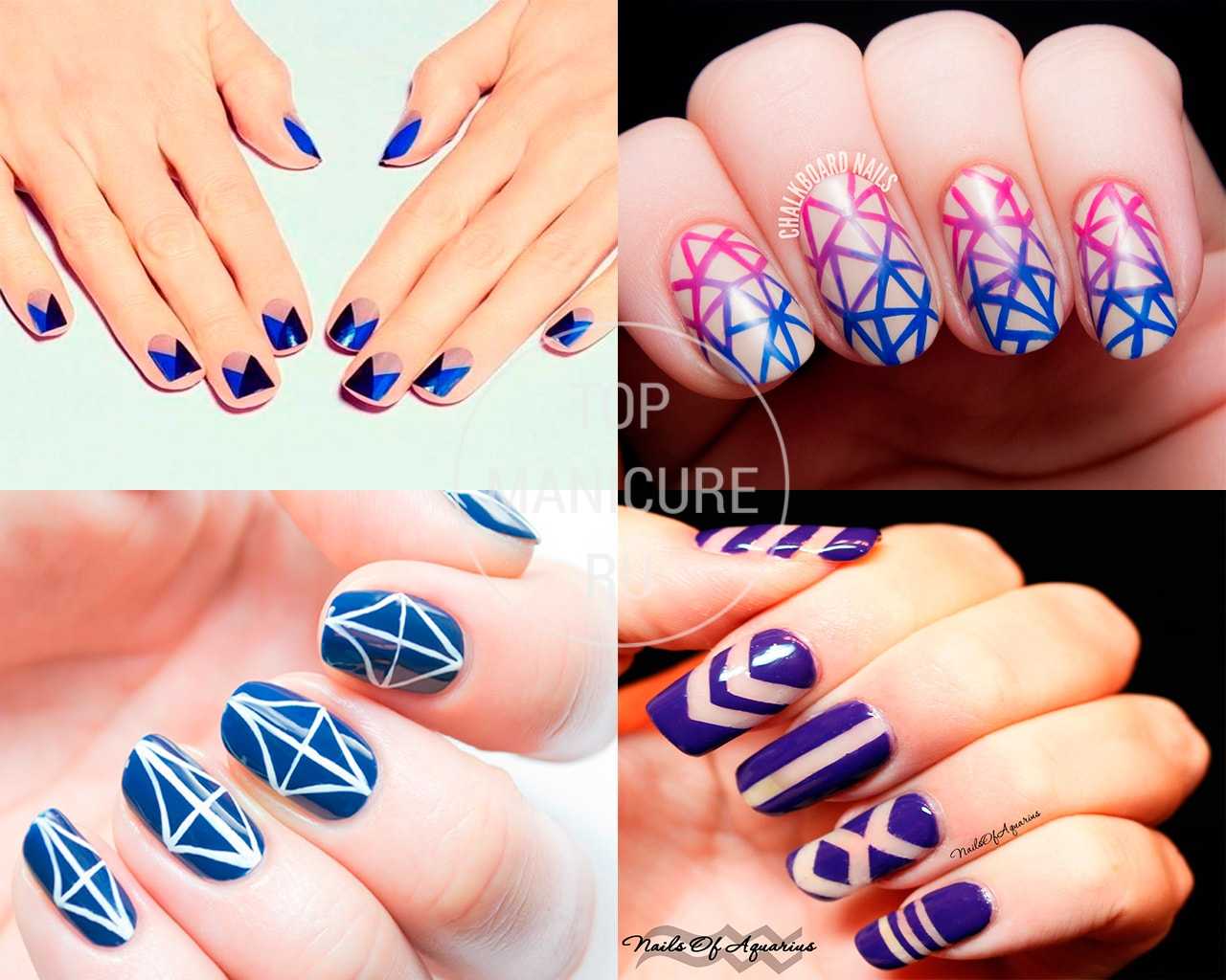 Если нравится маникюр с геометрическим рисунком, вы можете использовать шаблон, шотландскую ленту, кисть или обычный метод нанесения. Во всех вариантах такого маникюра допускается сочетание синего с другими цветами.