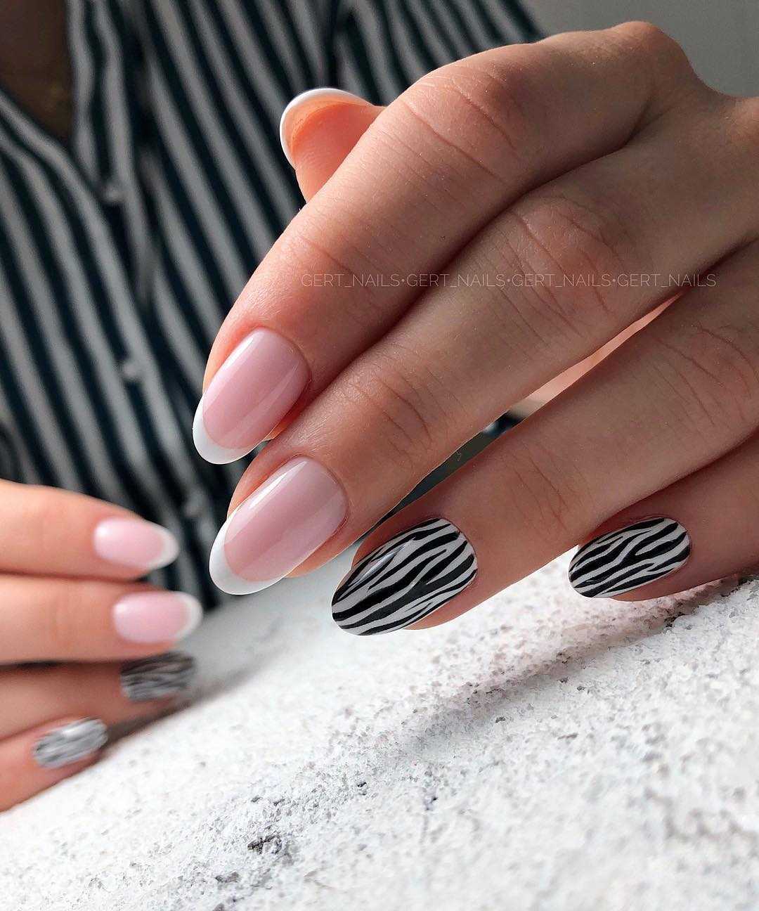 Дизайн ногтей претерпел множество изменений, и сейчас в нежном маникюре присутствует даже черный цвет. Он отлично сочетается с нежно-розовым. Изящно смотрятся следующие варианты: молочный с черным и белый во франче.