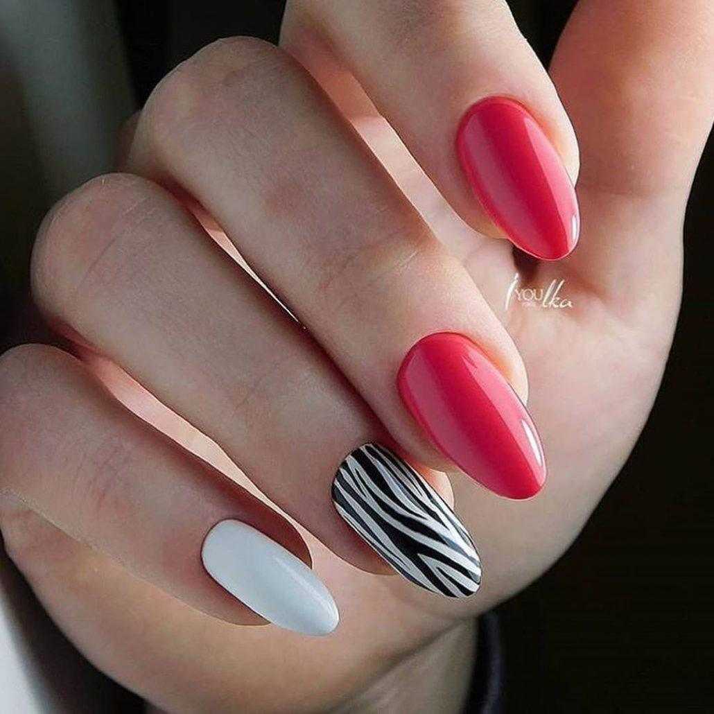 - ногти покрываются ярким монохромным цветным лаком, а фигуры прорисовываются черным;