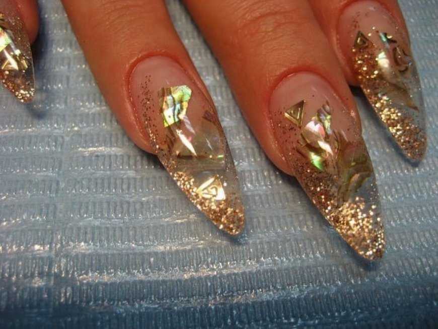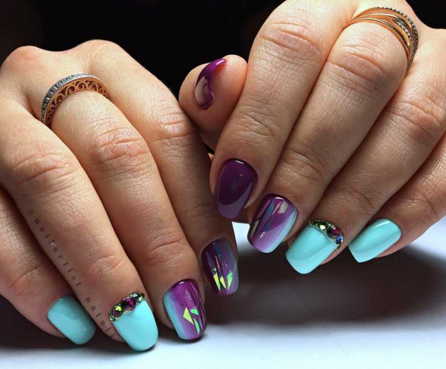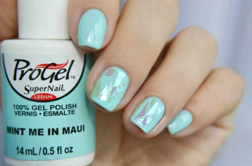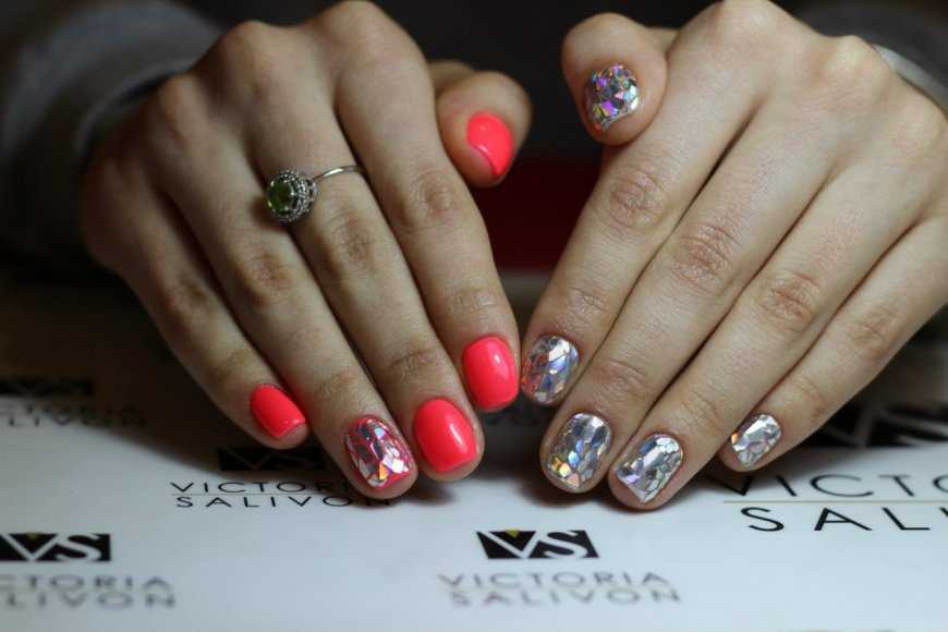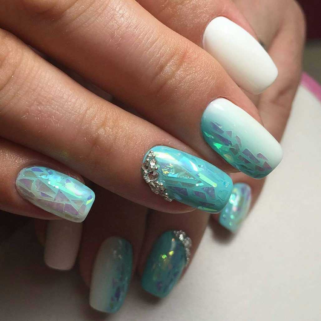 Зачастую девушки используют данный вид оформление летом. Ведь блики и переливание на солнце смотрятся очень необычно! С помощью умелого комбинирования цветов и переливающих осколков можно составить настоящий калейдоскоп.