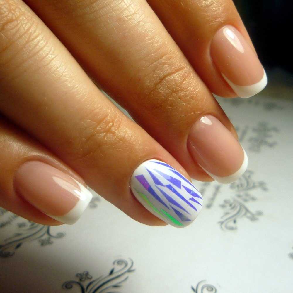 Можно выполнить традиционный французский дизайн, а два (безымянный и указательный) ноготочка украсить осколками близкими по цветовой гамме к основному цвету.