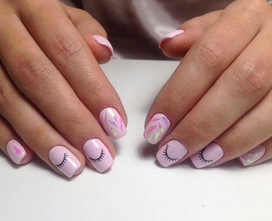 Сам по себе нейл-арт с осколками выглядит самодостаточно. Однако, при желании, его дополняют милыми изображениями. Профессионалы предупреждают, что с «битым стеклом» хорошо смотрятся только лаконичные и незамысловатые рисунки, например, реснички или стрелочки. Более сложные картинки создают эффект «переполненности» и выглядят неуместно.