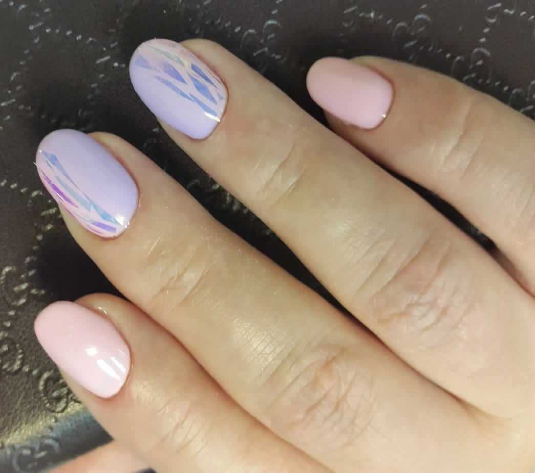 Для того чтобы маникюр выглядел лаконичным, но при этом имел свою неповторимую изюминку, можно оформить в стиле «битое стекло» только несколько ногтей, а остальные покрыть однотонным гель-лаком. Конечно же, сложно не упомянуть о романтичном и нежном варианте, в котором используются лаки пастельных тонов или вообще бесцветное покрытие, поверх которого в хаотичном порядке укладываются фольгированные кусочки.