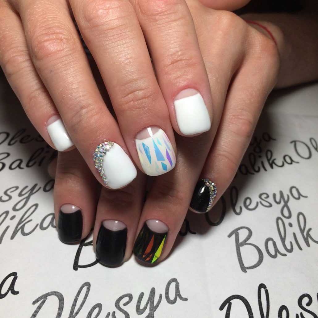 Нравится акцент на лунуле, но хочется чего-то новенького? Попробуйте «разбавить» лунный нейл-арт «битым стеклом». Оформленные голографической фольгой лунки смотрятся очень интересно. Особенно эффектен вариант с белой основой. Тогда игра света в гранях становится более заметной и впечатляющей.