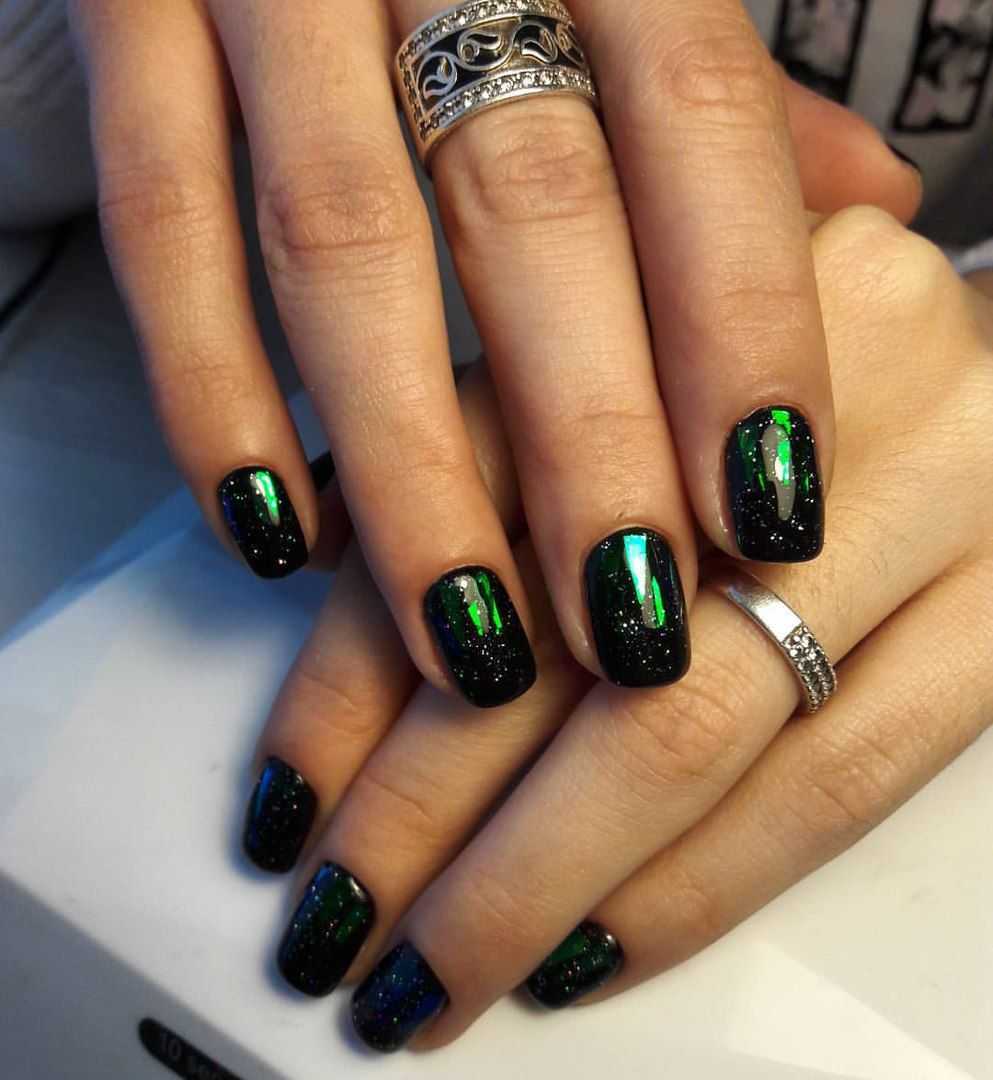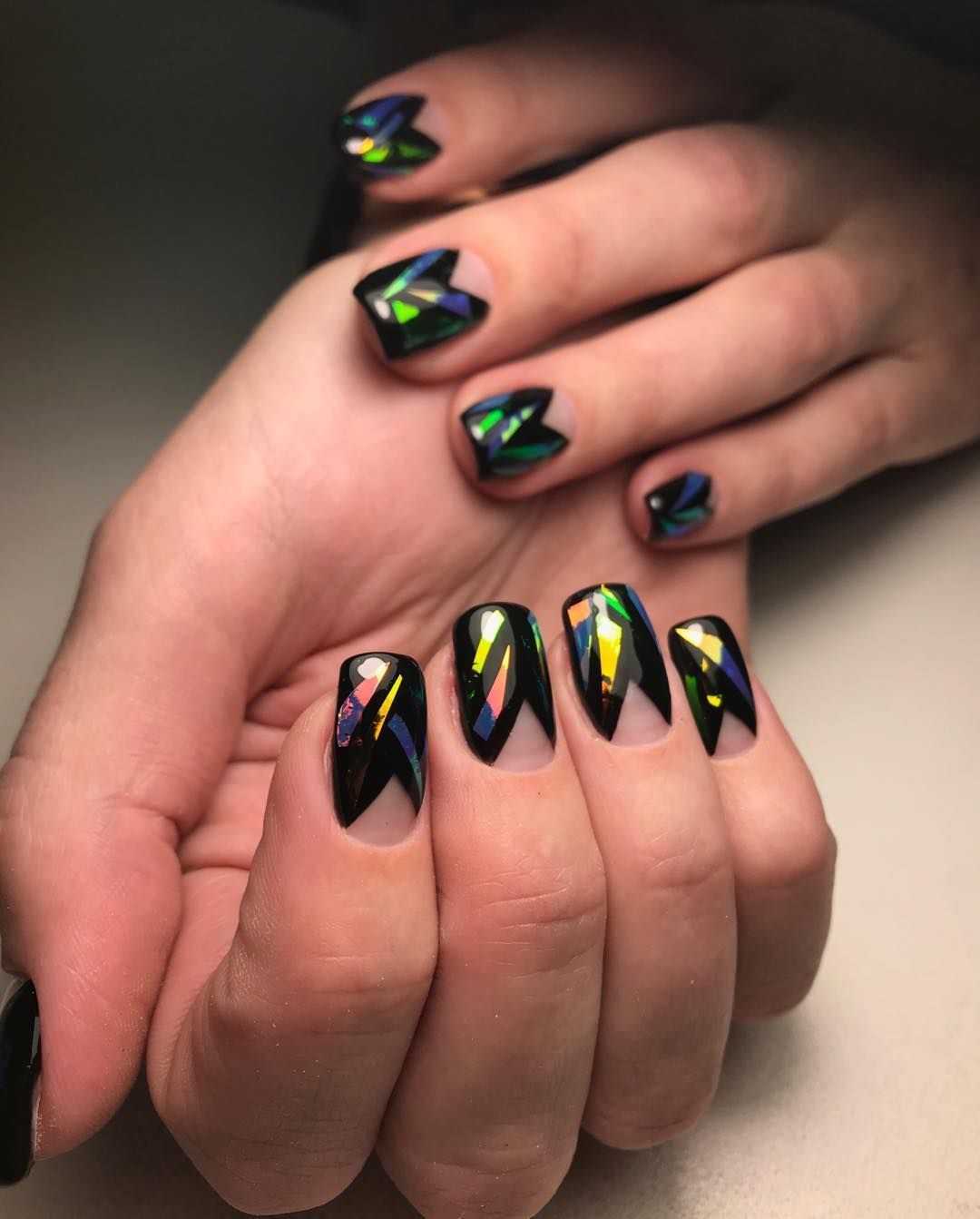 Сейчас особо популярно стало делать осколочки на чёрных ноготках. Этот дизайн просто великолепный!
