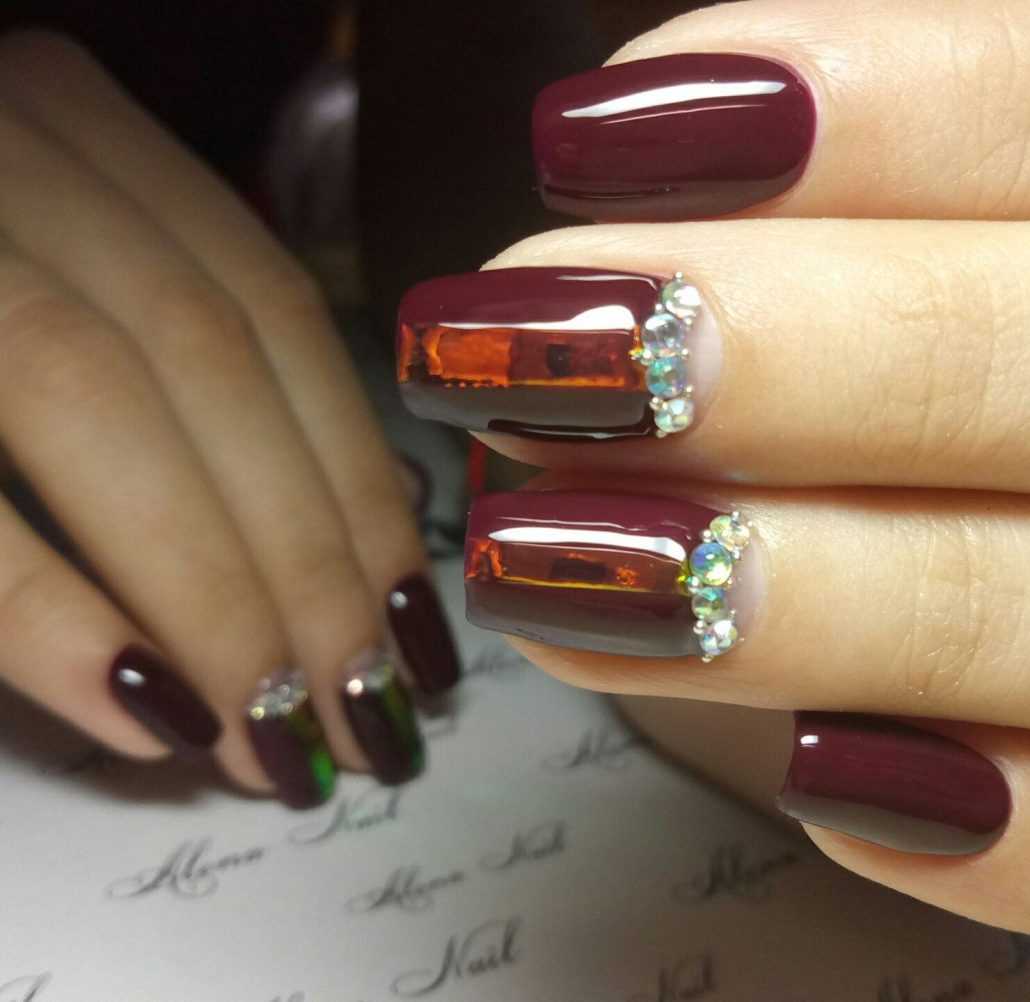 Интересно смотрятся блестящие кусочки на фоне глубоких оттенков базового лака. Особенно в этом сезоне актуален темно синий, фиолетовый, вишневый цвет.