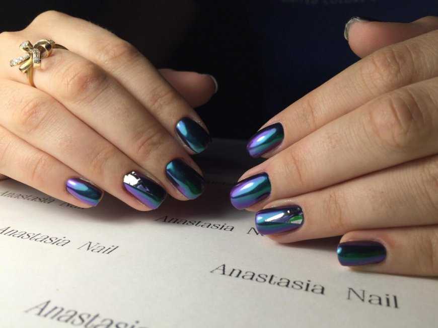 - Аккуратно накрасьте ноготки выбранным гель-лаком с зеркальным или голографическим эффектом, к примеру, «Кошачий глаз». Действие можно повторить, если нужно сделать цвет более насыщенным. Сушите под лучами лампы.