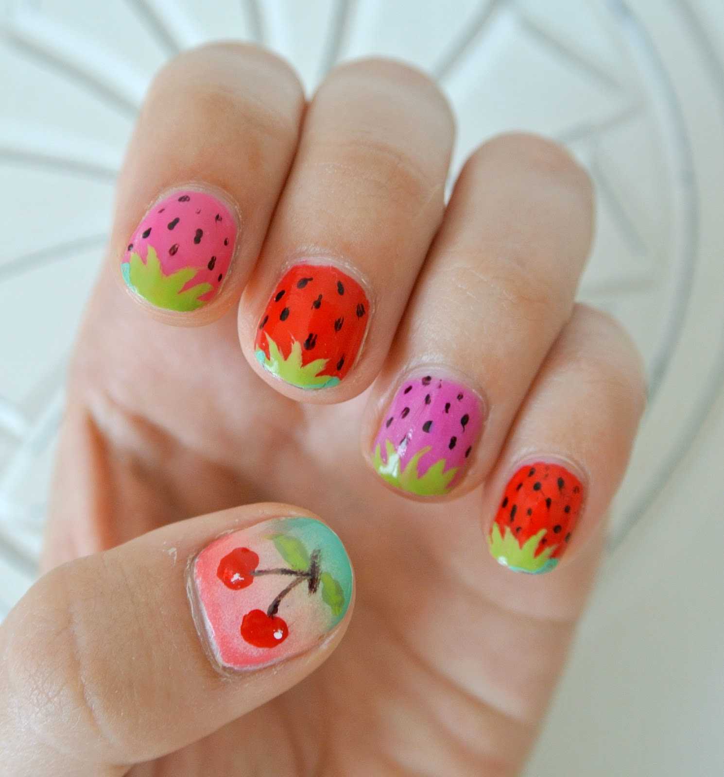 Еще одна простая идея дизайна для детей – нарисовать (кистью или зубочисткой) простые узоры (ягоды, маленьких животных, звезды и т.д.). Не менее интересный лак можно сделать с помощью губки, нанеся на нее лак и нанеся его в таком виде на ногти (получится очень интересный и завораживающий как галактический калейдоскоп маникюр или маникюр в стиле градиент). Такие легкие и простые образы для детского маникюра позволят маленькой девочке почувствовать себя настоящей принцессой и взрослой леди.