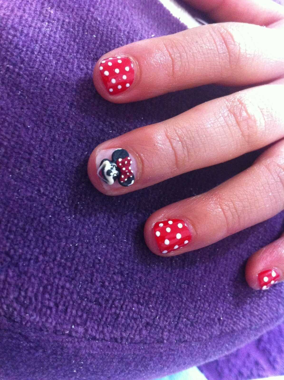Особенность маникюра “Микки” в том, что он будет отлично смотреться в оттенках розового, красного и других ярких и женственных тонах. Чтобы дизайн не выглядел слишком вульгарно и имел самодостаточный вид, мультяшный персонаж изображен на одном ногте, а остальные пальцы оформлены в аналогичном стиле.