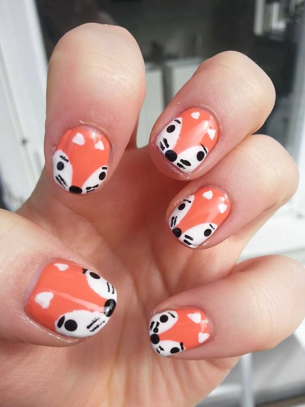 Можно закрасить весь ноготь желтым — тогда получится увеличенная мордочка с дополнениями в виде глазок ротика и кругленьких щечек. А можно покрыть только половинку ногтя, но в этом случае, необходимо дорисовать тоненькой кисточкой ушки.