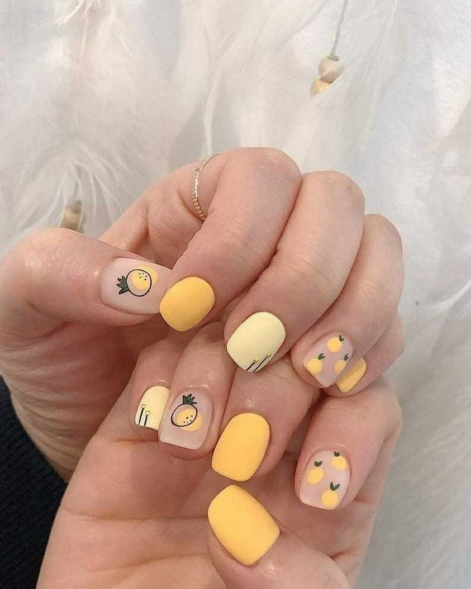 На акцентных пальцах (там, где будет рисунок) ноготок покрывают желтым цветом.