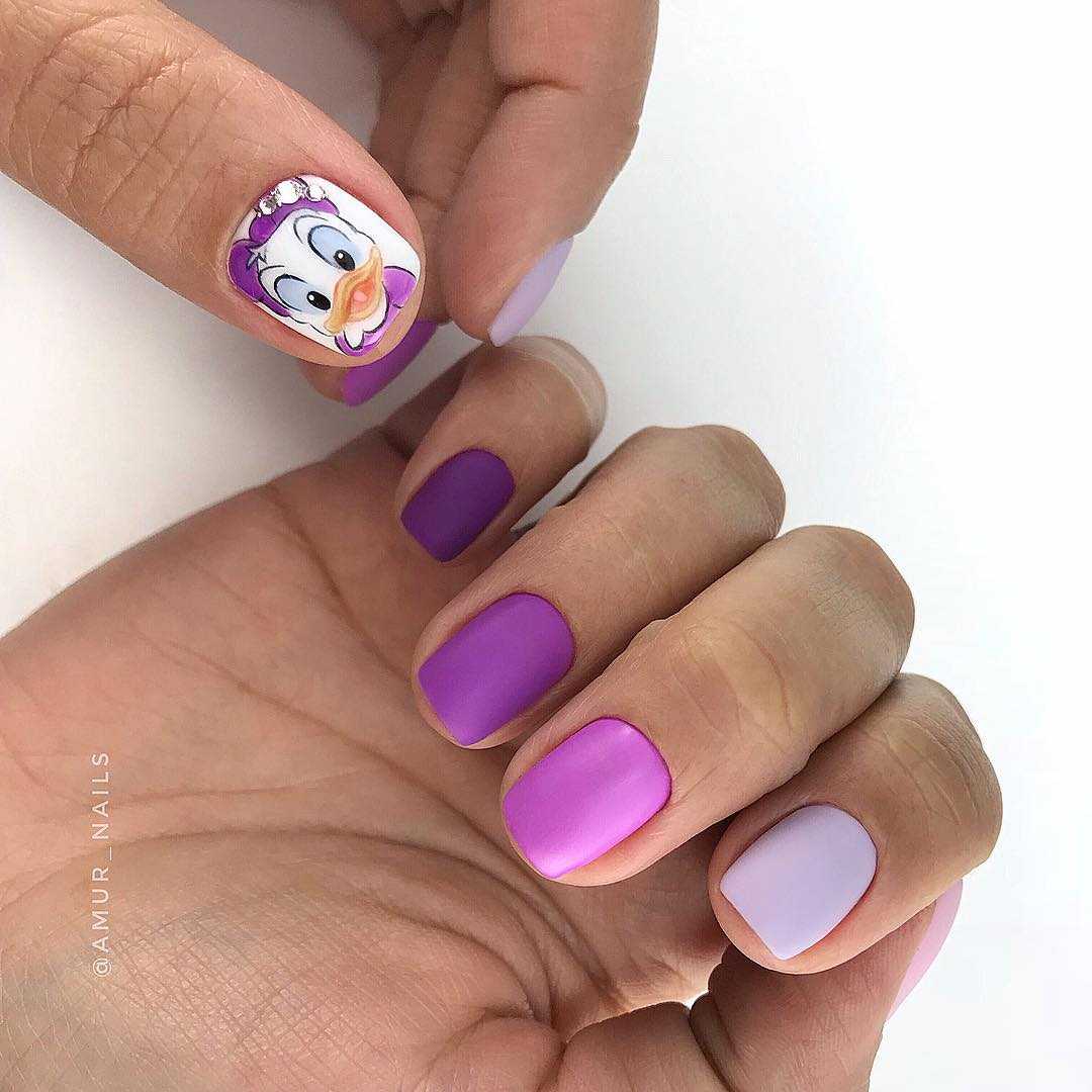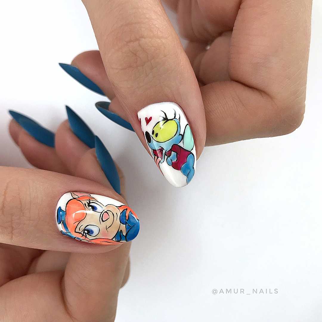 Выбирайте для маникюра героев мультфильмов, комиксов и аниме. Самое простое решение – использовать готовые наклейки, которые легко перенести на ногтевую пластину. Более сложная задача – рисовать персонажей кистью и точками. При этом лучше всего ориентироваться на фотографию.