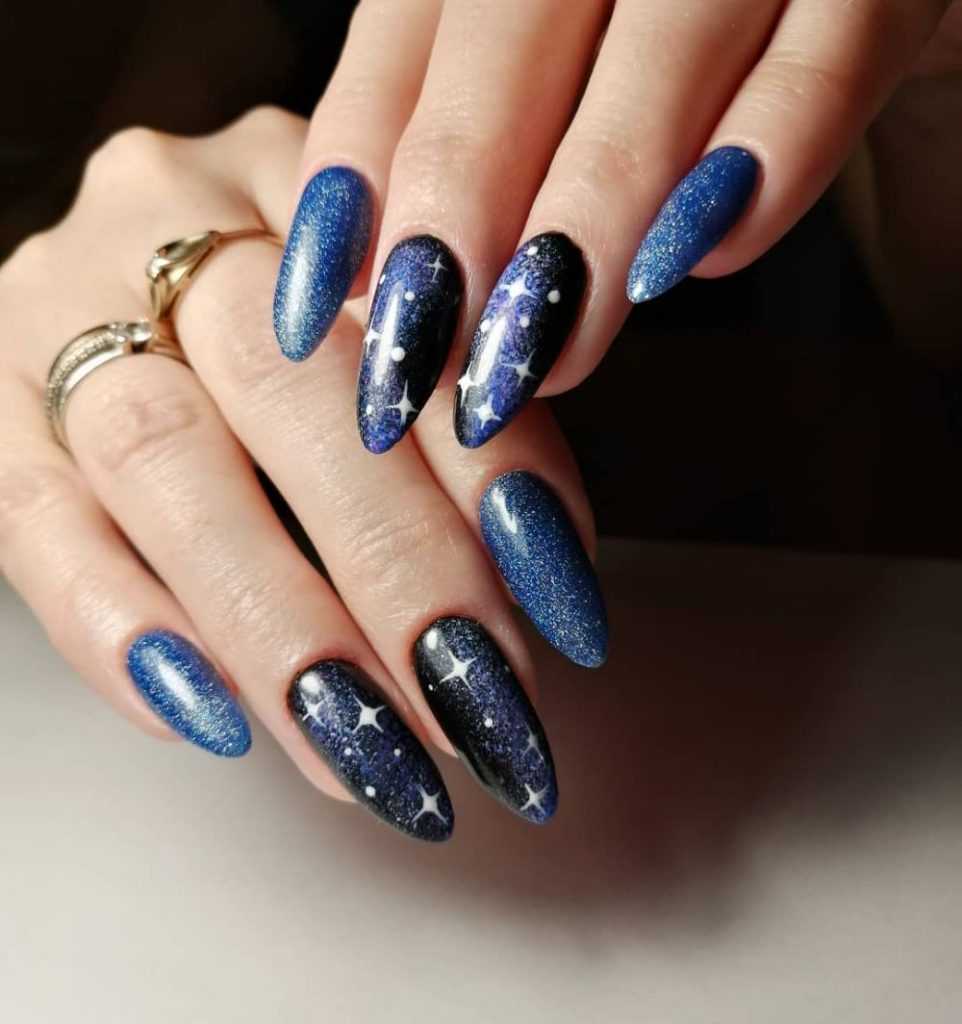 Отличительная черта космического маникюра — насыщенный черный и синий цвет в сочетании с фиолетовыми, синими и белыми бликами. Часто дизайн дополняют изображениями звезд, планет, туманностей. Тенденции 2022 года предлагают сочетать картины звезд с однотонной краской смежных тонов: синего, черного, туши, бордового. А добавив «пространства» к более спокойному нюдовому маникюру, можно получить его более смелый вариант.