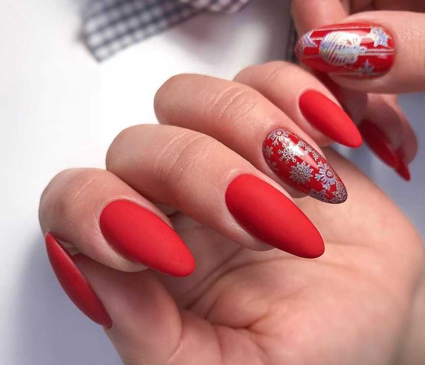 Для того чтобы получить действительно нежный новогодний маникюр на острый миндаль, придется отказаться от явного дизайна. Чем меньше декора и украшений будет на ногтях, тем элегантнее они будут смотреться.