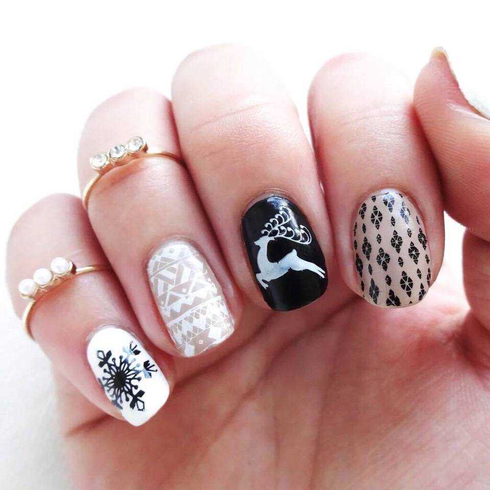 Такой оригинальный маникюр точно соответствует теме зимы, поскольку в нём используются «олени», «снежинки» и другие элементы скандинавских узоров. На фото показан пример.