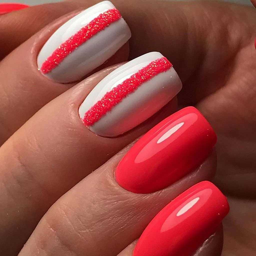 Одна из самых трендовых тем в маникюре 2020 – колор-блоки. Они великолепно смотрятся именно на коротких ногтях, так как визуально расширяют ногтевую пластину, делают ее более утонченной и изящной. Колор-блоки в коралловом цвете сочетают с белым, розовым, сиреневым оттенком. Невероятно стильно выглядит этот дизайн с серебристыми блестками и втиркой.