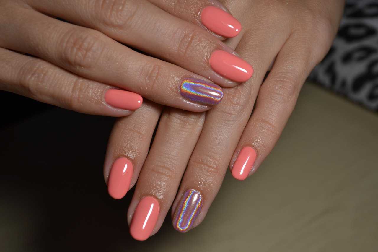 - Однотонный маникюр. Неоновым оттенкам предпочтите более спокойные, мягкие, приглушенные коралловые тона из пастельной гаммы.