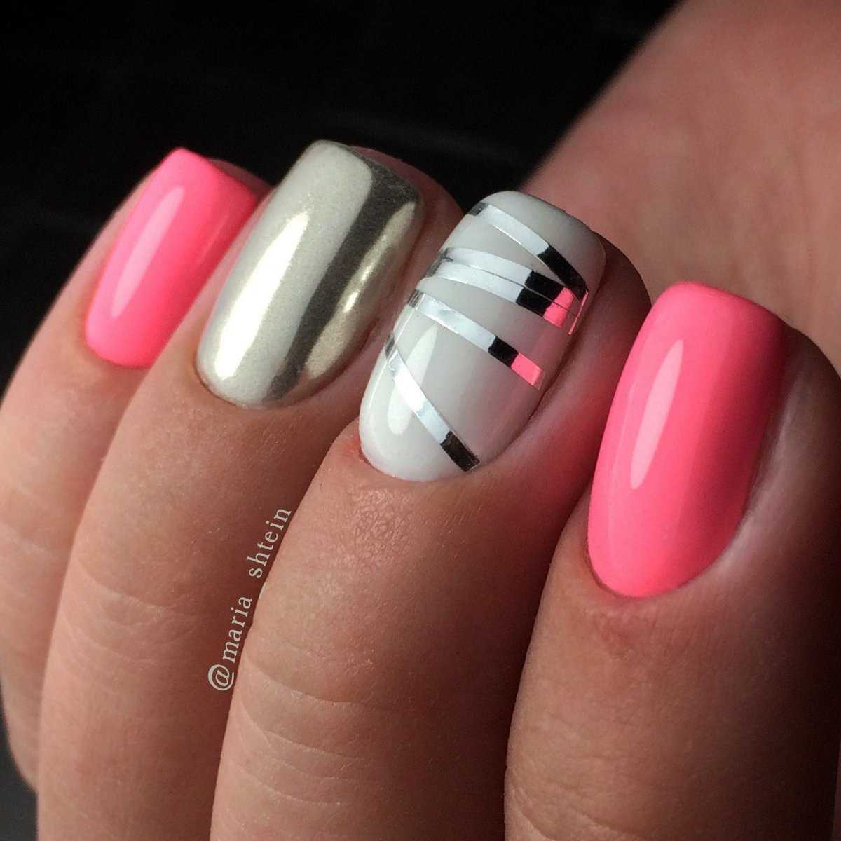 Оттенки розового цвета прекрасно дополняют коралловые тона. Они подчеркивают изящность женских рук и добавляют образу больше яркости. Оттенки кораллового цвета вместе с розовым, а также незамысловатыми рисунками.