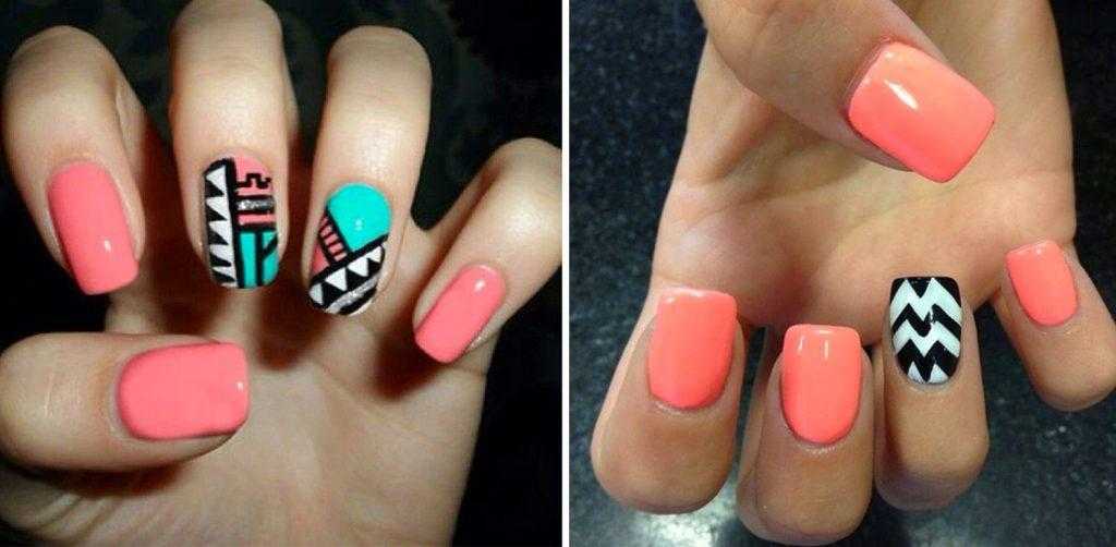 Самый выигрышный вариант – это черный на коралловом. Рисунки или узоры, выполненные черным лаком, не оставят равнодушными. Добавление золота в коралловый маникюр придаст образу благородный и загадочный вид царственной особы. Хотите разнообразить маникюр яркостью? Тогда для вас подойдет сочетание кораллового с бирюзовым. В теплый сезон обязательно надо попробовать сочетание мятного и кораллового цветов, придающее образу летнюю легкость и загадочность.