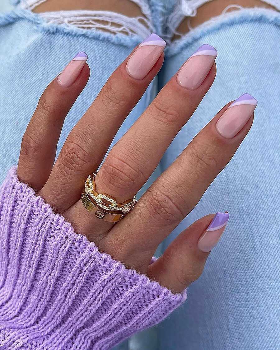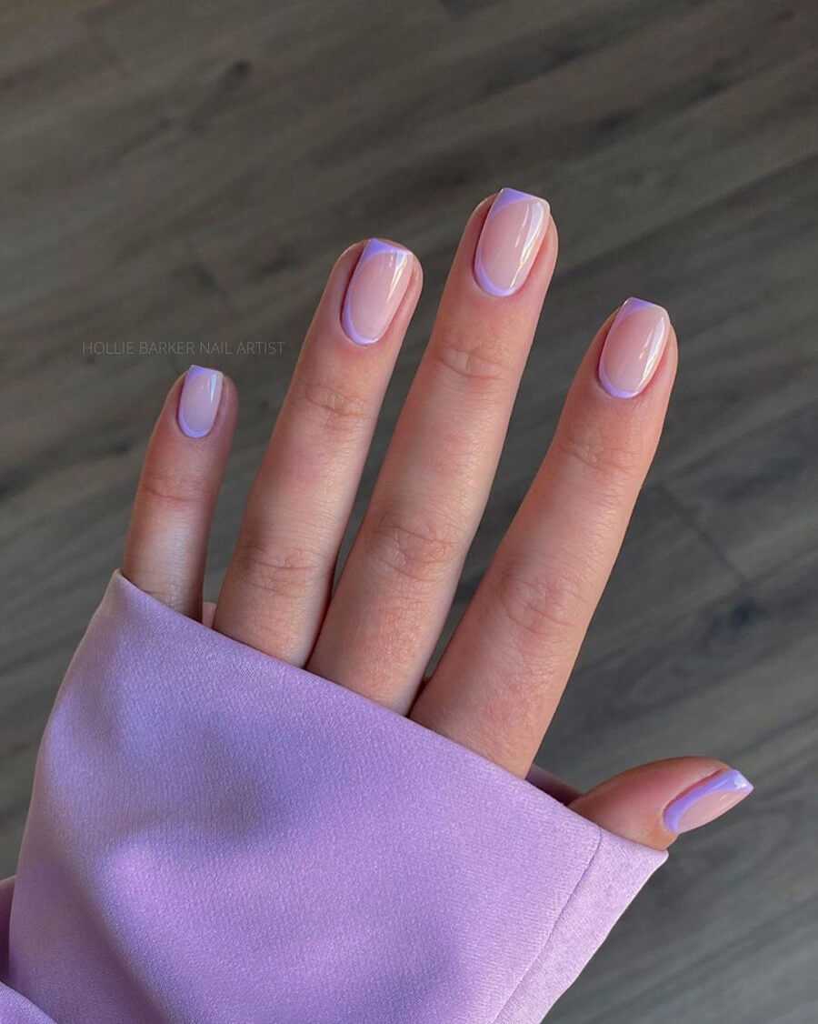 нюд и лаванда. Еще один интересный вариант для покрытия, если хочется чего-нибудь оригинального. Сам по себе лавандовый оттенок довольно яркий, даже если взять самые приглушенные оттенки. А вот добавить немного лаванды к бежевому нюду — это идеально. Можно сделать любой небольшой лавандовый акцент на ногтях.