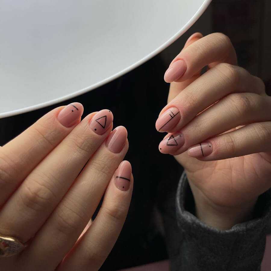 Оформление ногтевой пластины полосками и лентами сочетается и с другим минималистичным геометрическим дизайном: точки, фигуры, фольга