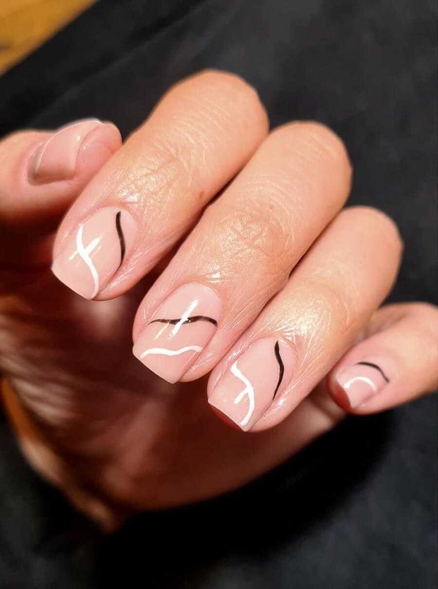 На коротких ногтях в сезоне 2021-2022 хорошо выглядят нюдовые тона. Полоски можно размещать в любом направлении, но чтобы визуально удлинить ноготь, лучше размещать полоски вертикально. Такой дизайн может сгладить неровности на ногтевой пластине. При выборе формы лучше отдавать предпочтение мягкому квадрату и «миндалю».