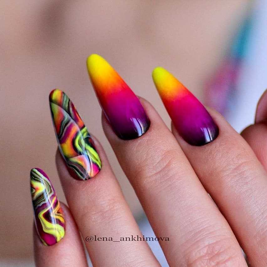 - При помощи круглой кисти нанести на ноготь каждый из цветов. Начинать нужно от основания ногтя и двигаться вверх. Движения руки должны быть слегка хаотичными, цвета нудно лишь слегка примешивать друг к другу, давая им растекаться в произвольном порядке.