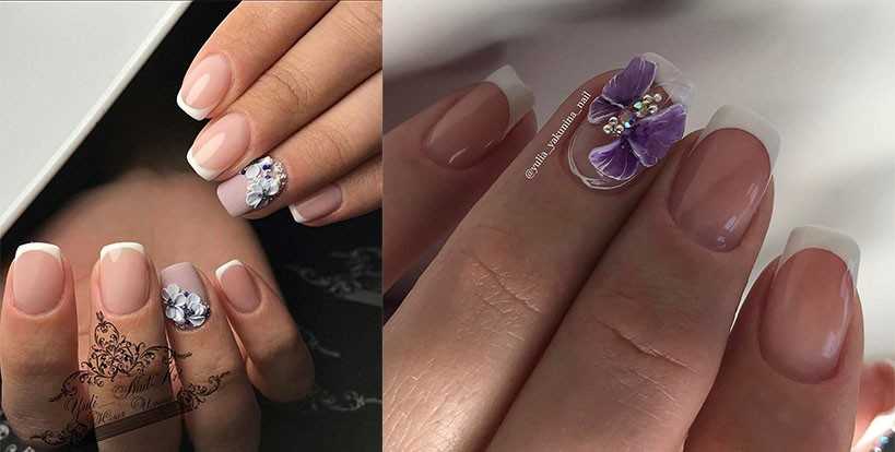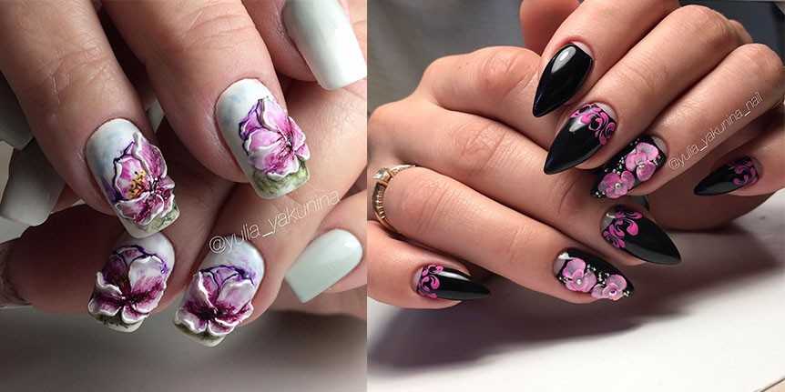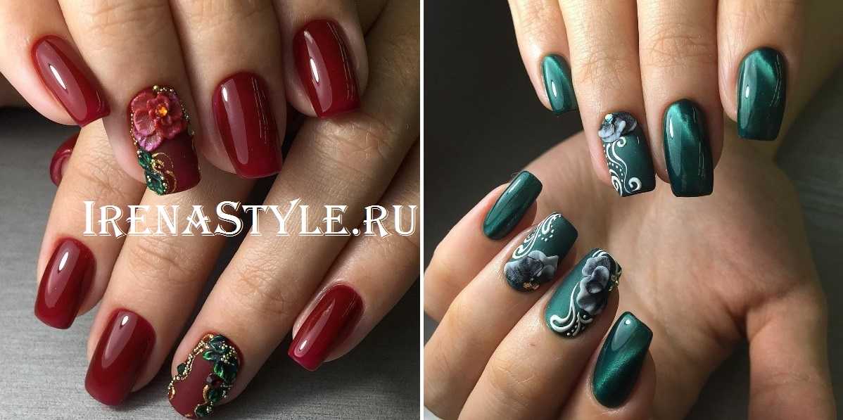 - Растительная тематика. Невероятные цветы и листья, лепестки, скульптурированные из 4D-геля, смотрятся на ногтях как живые.