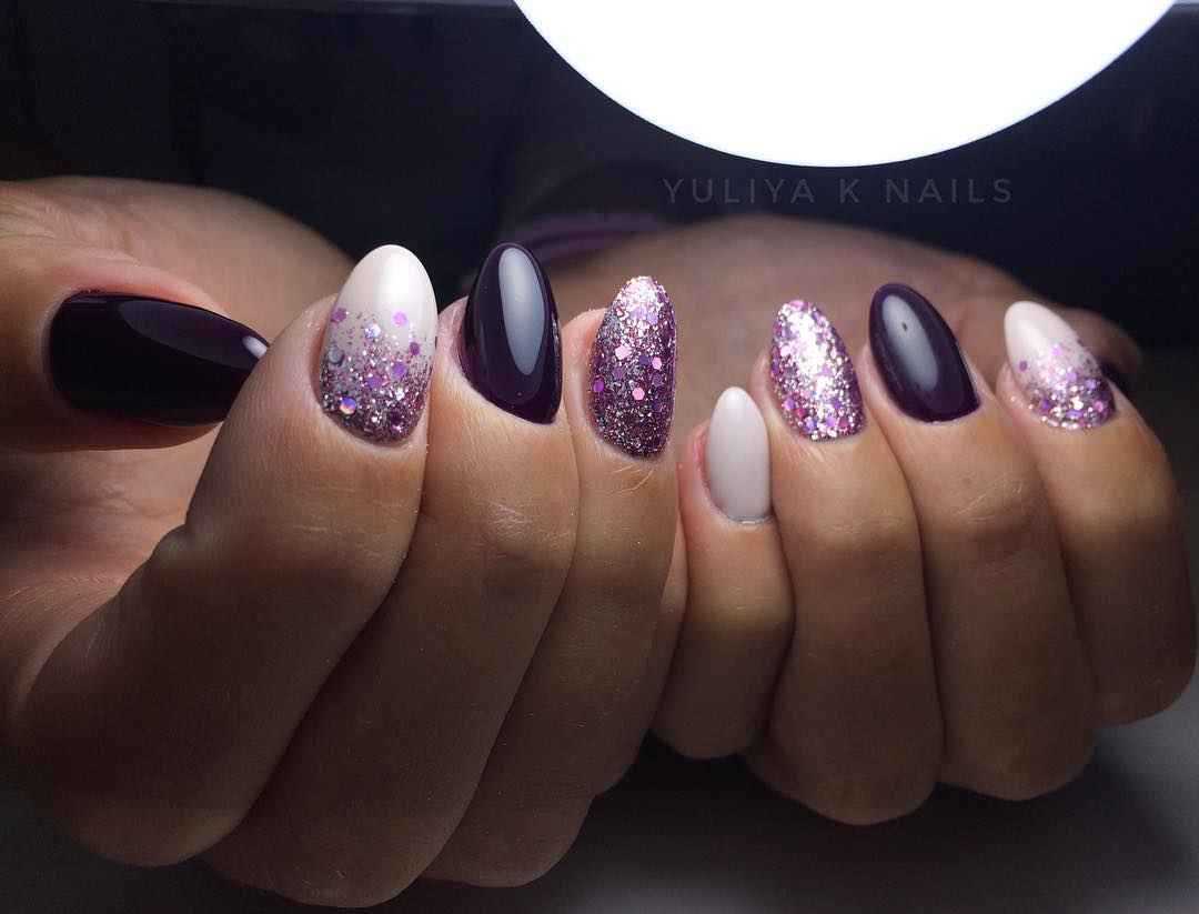 Блестки позволяют украсить баклажановый маникюр, при этом, не перегружая его лишними деталями. Максимально эффектно будут смотреться на длинных ногтях и ногтях средней длины. Достаточно декорировать блестками 1-2 ногтя либо неплотным слоем присыпать ими каждый из пальцев.