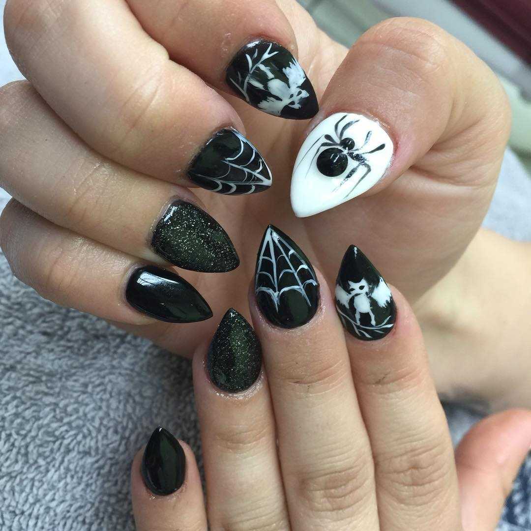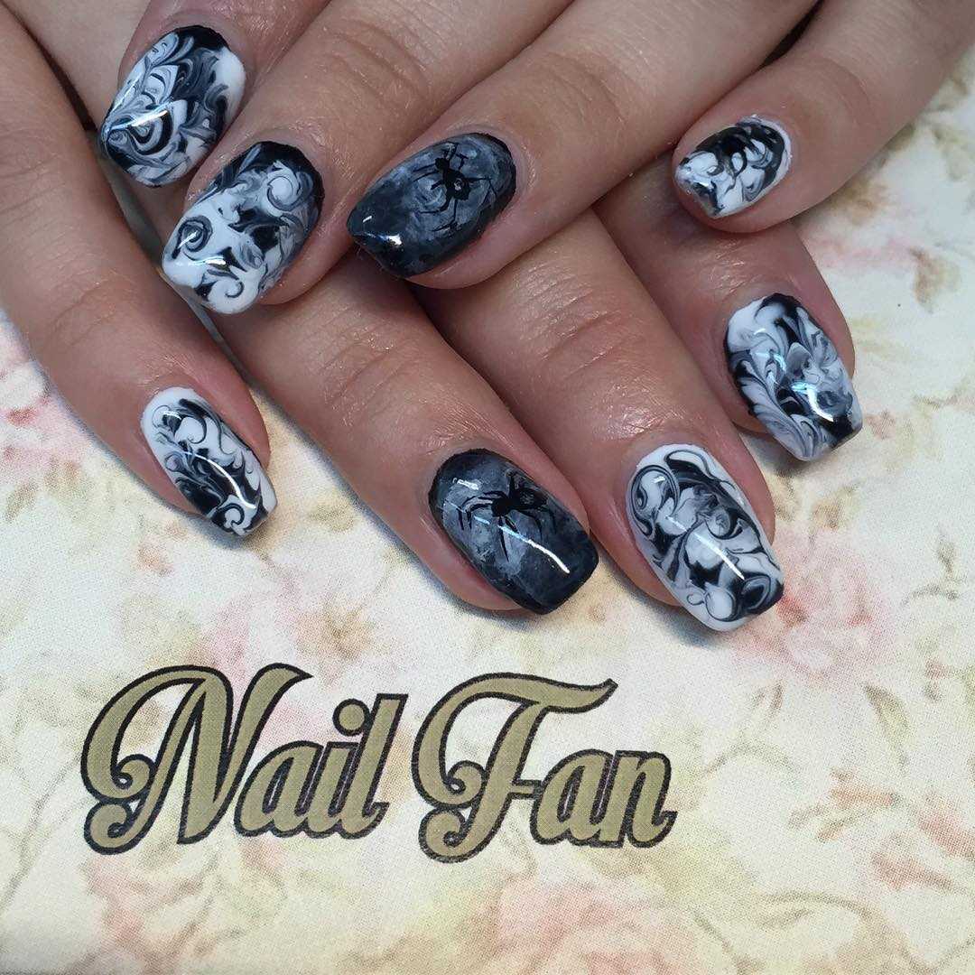 На средних, указательных и мизинцах можно нарисовать красивую паутинку, используя черный цвет и белый для окантовки, чтобы получился своеобразный контраст. А вот ногти безымянных пальцев – это отличный вариант для размещения маленьких черных пауков, также дополненных небольшой паутинкой.