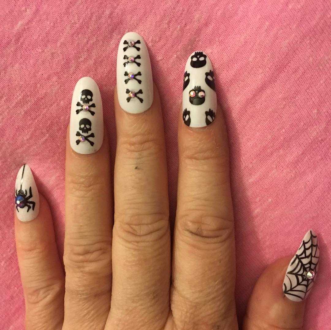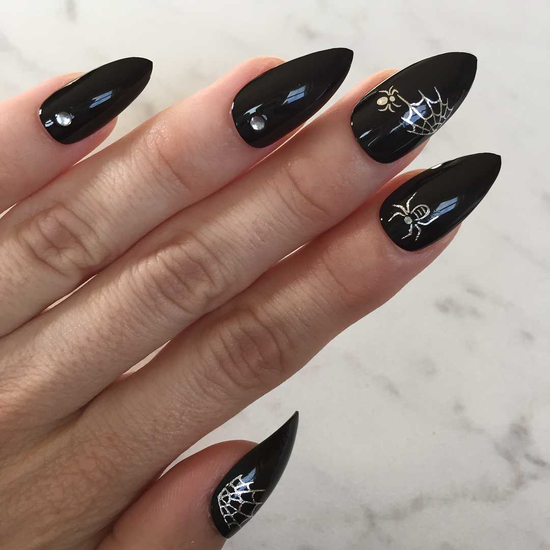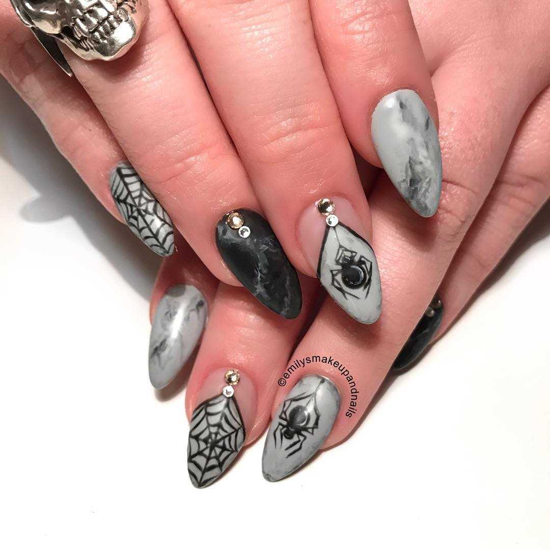 Для тематической вечеринки можно остановиться на черно-сером маникюре с паутиной. На черном глянцевом и сером лаках прекрасно смотрится белая паутинка с хаотично расположенными на ней стразами различных размеров. Но, чтобы не делать все ногти черными, безымянные можно покрыть белым цветом и нарисовать на них паучков, также дополненных стразами или камнями.