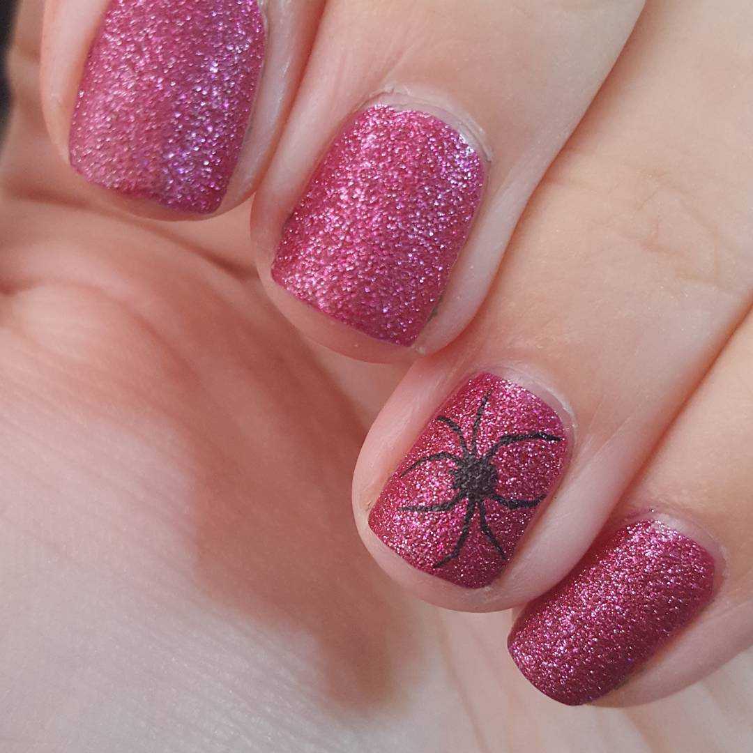 Рисунок паука на ногтях трех цветов с глиттером.