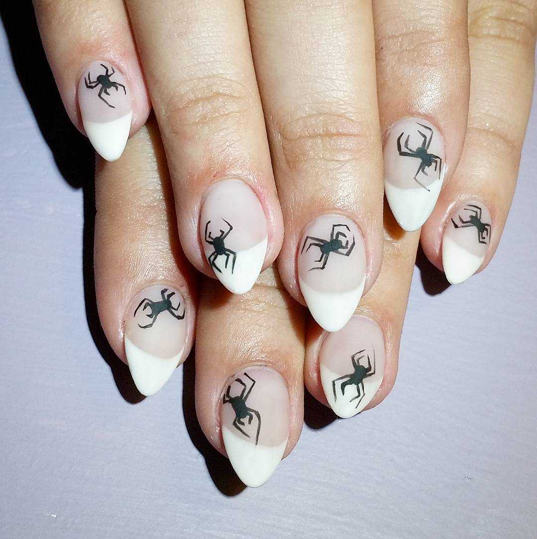 С пауком хорошо выглядит французский маникюр: классический или цветной, при этом на безымянном пальце рисуют насекомое, которое спускается по паутине. Иногда изображают целую семью.