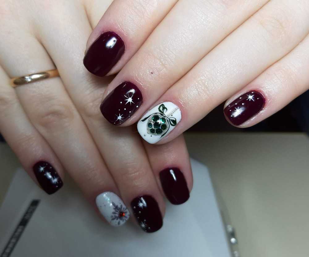 Дизайн ногтей делаем со стразами. Они и будут елочными игрушками. Можно использовать один крупный камушек в красном цвете или собрать несколько маленьких. Также интересно получается, если игрушку сделать из гель-лака и покрыть втиркой.