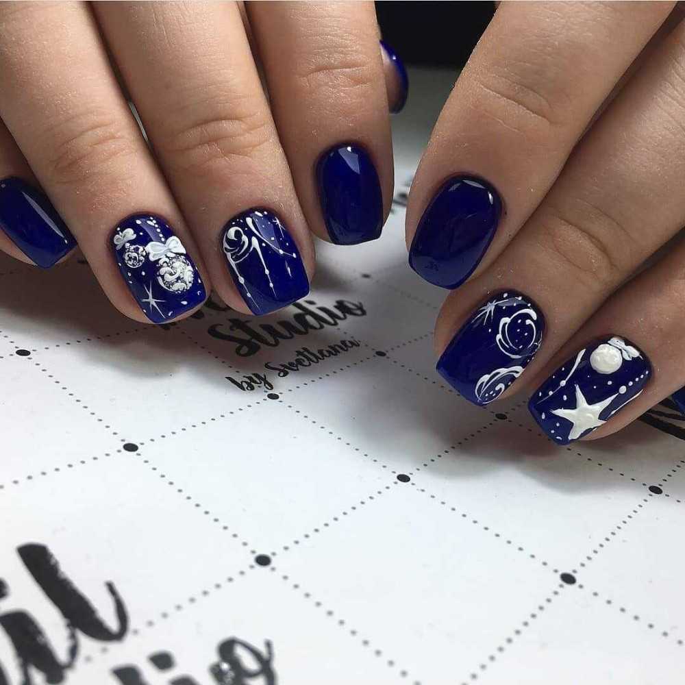 Поскольку этот цвет считается одним из традиционных новогодних, имеет смысл обратить внимание именно на маникюр, в котором его используют. Кроме того, стоит присмотреться в таким оттенкам, как зеленый, темно-синий, ярко-голубой и глубокий фиолетовый