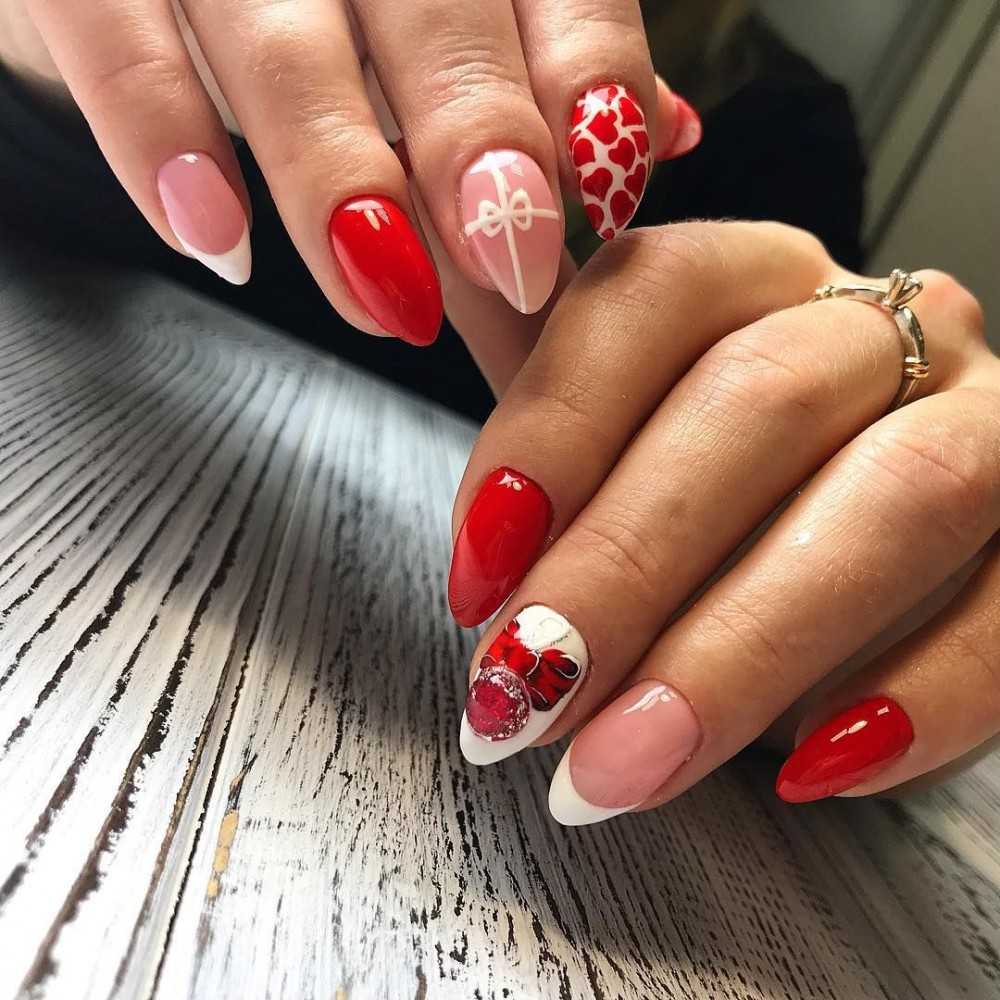 Маникюр с белыми и красными оттенками считается базовым, но его можно разнообразить объемными стразами, узорами и серебристыми вкраплениями. Маникюр со стразами украсит и дополнит любой образ.