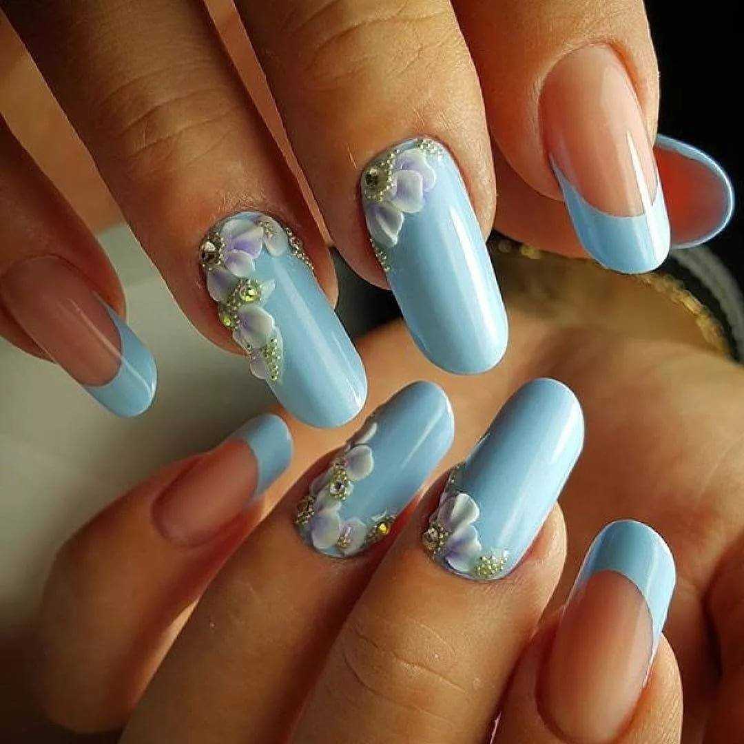 Наиболее приемлемым вариантом станет аккуратный вариант пастельного нежного голубого оттенка, разбавленный белым френчем. Использование светлых оттенков дополнительно визуально увеличит ногти.