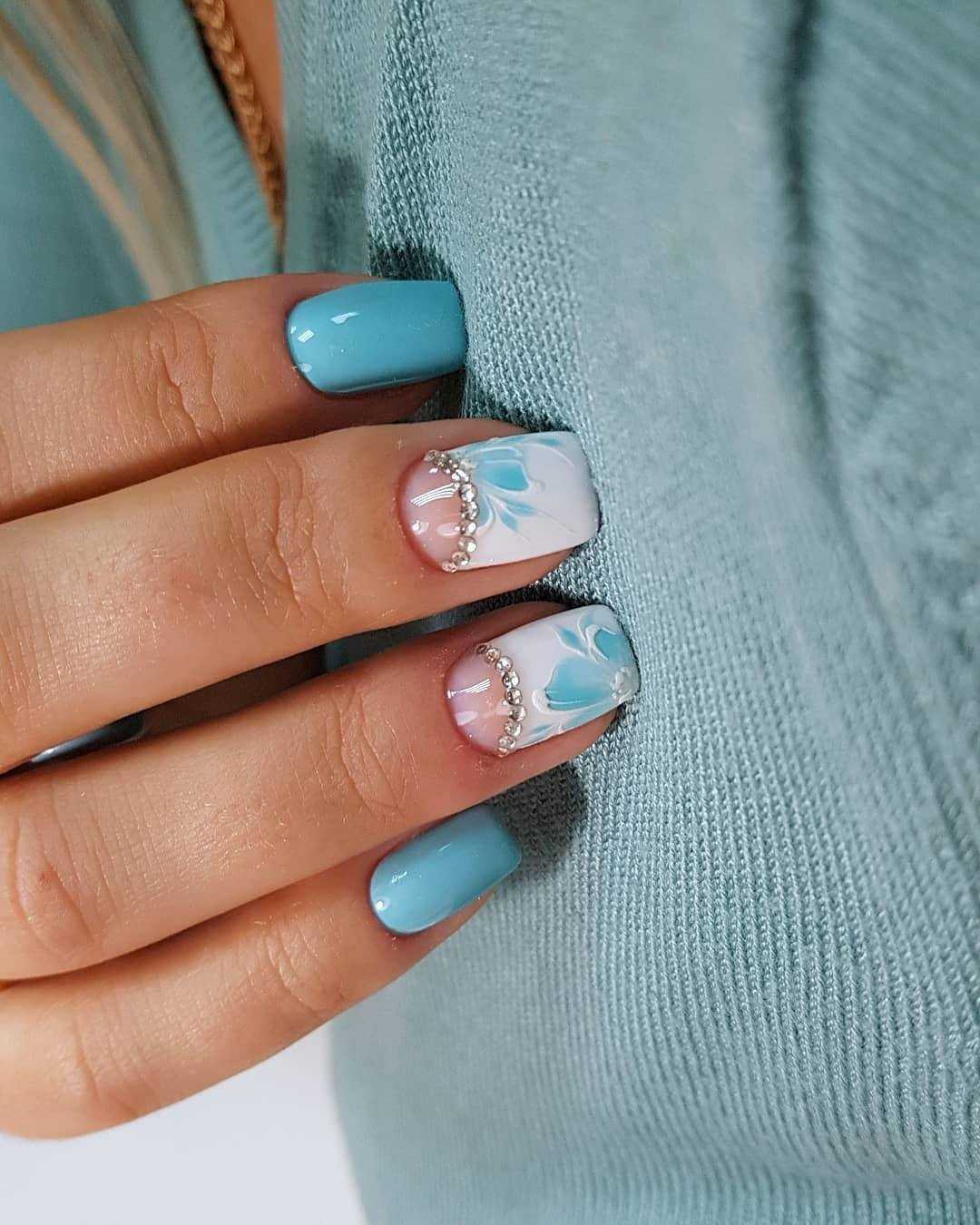 Голубые сдержанные оттенки идеальны в сочетании с белым лаком и дополнениями в виде страз. Можно сочетать в одном маникюре различные размеры страз, начиная от пикси и заканчивая более крупными
