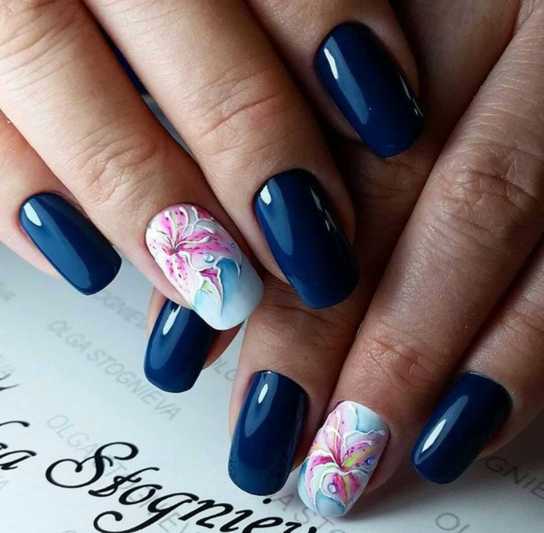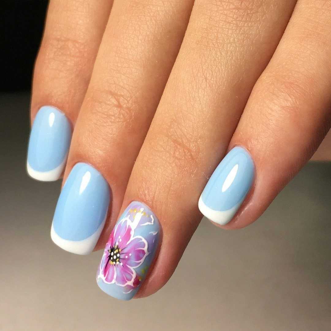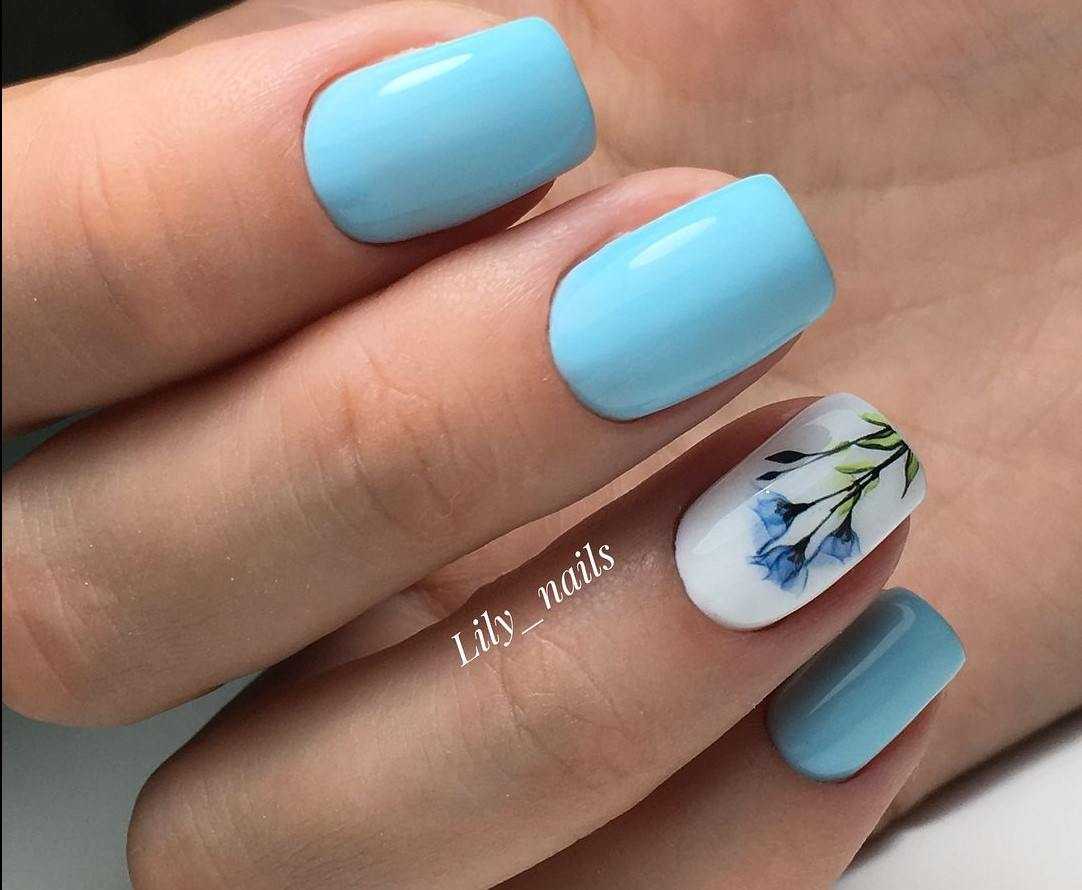 Светлые нежные оттенки смотрятся на коротких ногтях гораздо эффектнее, чем насыщенные темные тона. Пастельная цветовая палитра освежает маникюр, делает образ нежнее и женственнее. Что касается флористики в голубом цвете, то тут нет практически никаких ограничений. В тренде узоры минимализм с небольшими цветами на белом или другом светлом фоне.