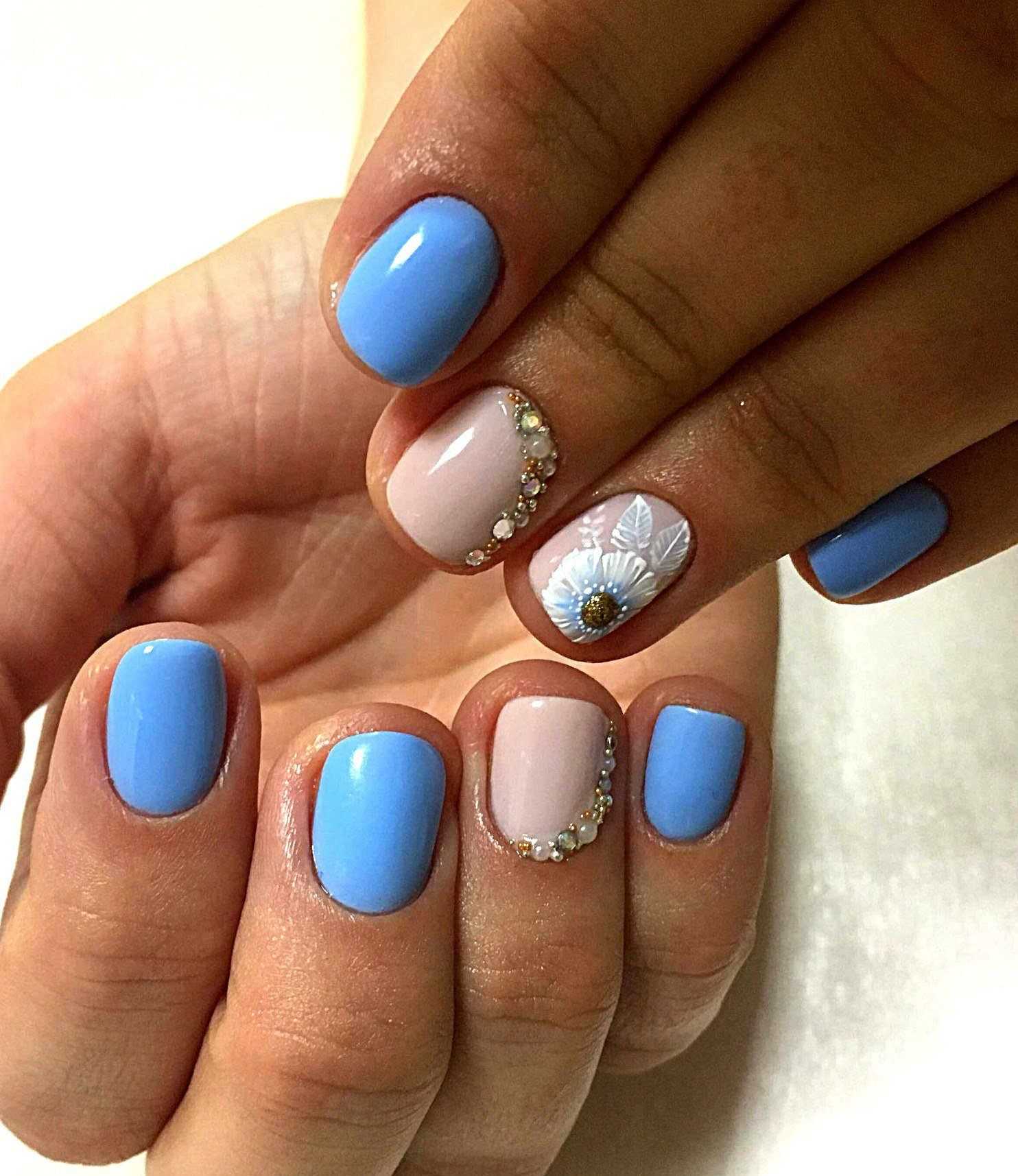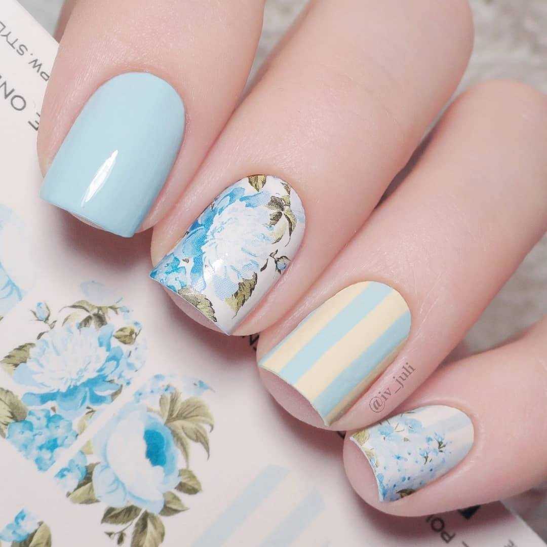 Красиво смотрится сочетание голубого и кремового цветов на коротких ногтях. Цветы можно выполнить как голубым, так и белым цветом. При создании маникюра с цветами на коротких ногтях очень помогут слайдеры или стемпинг. Они помогут создать детальный узор на небольшом пространстве ногтевой пластины.