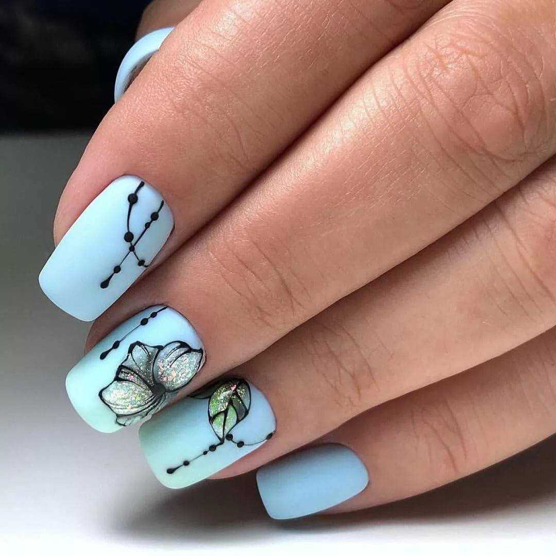Идеи голубого маникюра 2020 с рисунками и дизайном