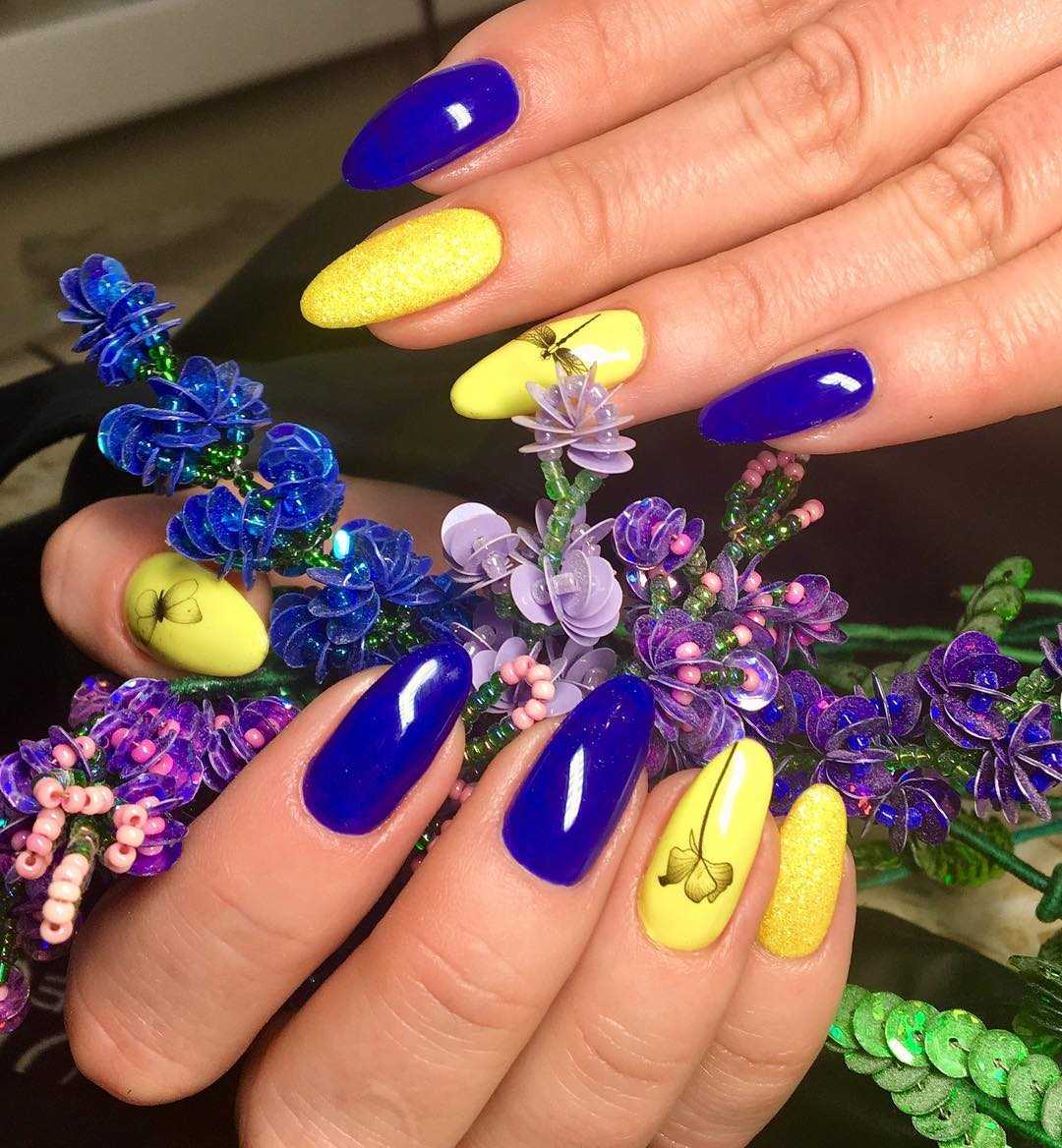Не все оттенки желтого смогут ужиться в одном нейл-арте с голубым и розовым. Если речь идет о неоновом маникюре, то и желтый должен быть таким же — кислотным, запредельно ярким. А в остальных случаях розовый и голубой примут в свою компанию разве что цвет яичного желтка или пастельный желтый.