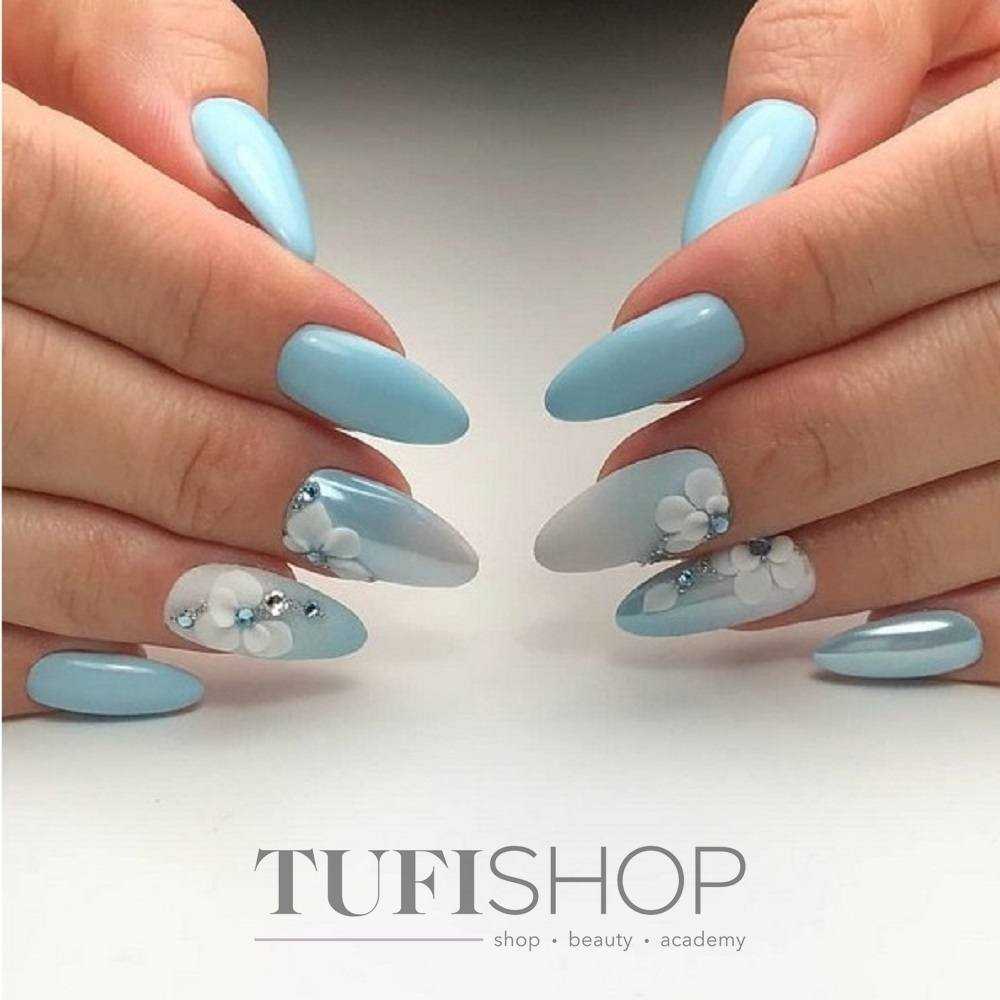 Кроме того белый и голубой часто используют для градиентного маникюра, который потом дополняется цветочным, ажурным или геометрическим декором. Белый цвет также используют для маникюра с лепкой и другим объемным декором.